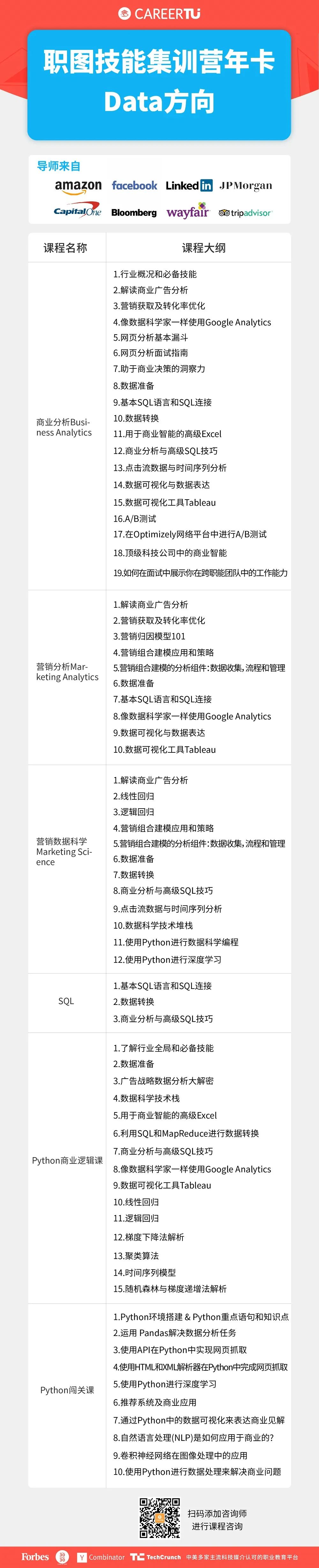 课程旨在帮助在校学生、毕业求职者和在职工作人士学习掌握互联网热门行业硬技能,知识点涵盖SQL、Python、Google Analytics、Google Ads、Tableau、Mailchimp 、Sketch等。