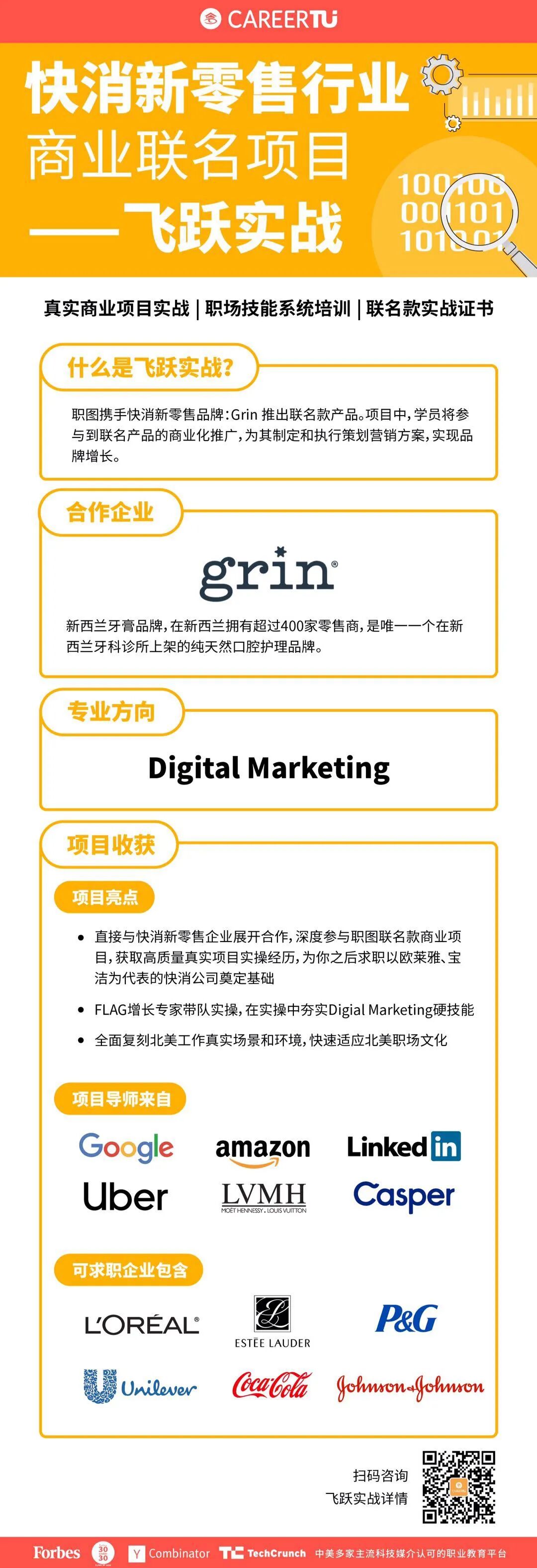 1.直接与快消新零售企业展开合作,深度参与职图联名款商业项目,获取高质量真实项目实操经历,为你之后求职以欧莱雅、宝洁为代表的快消公司奠定基础