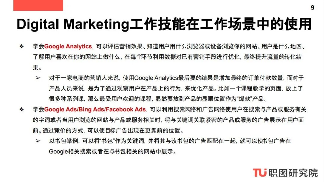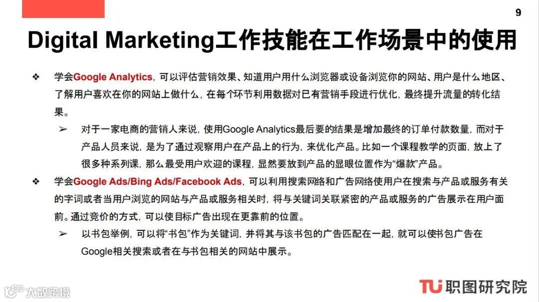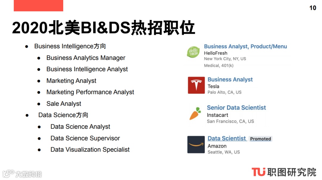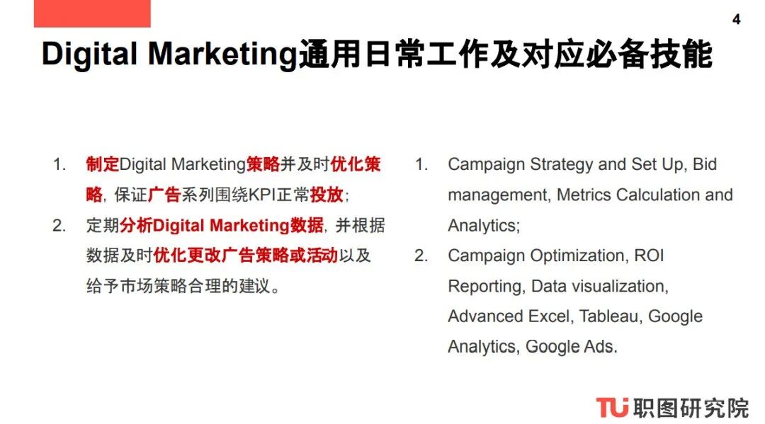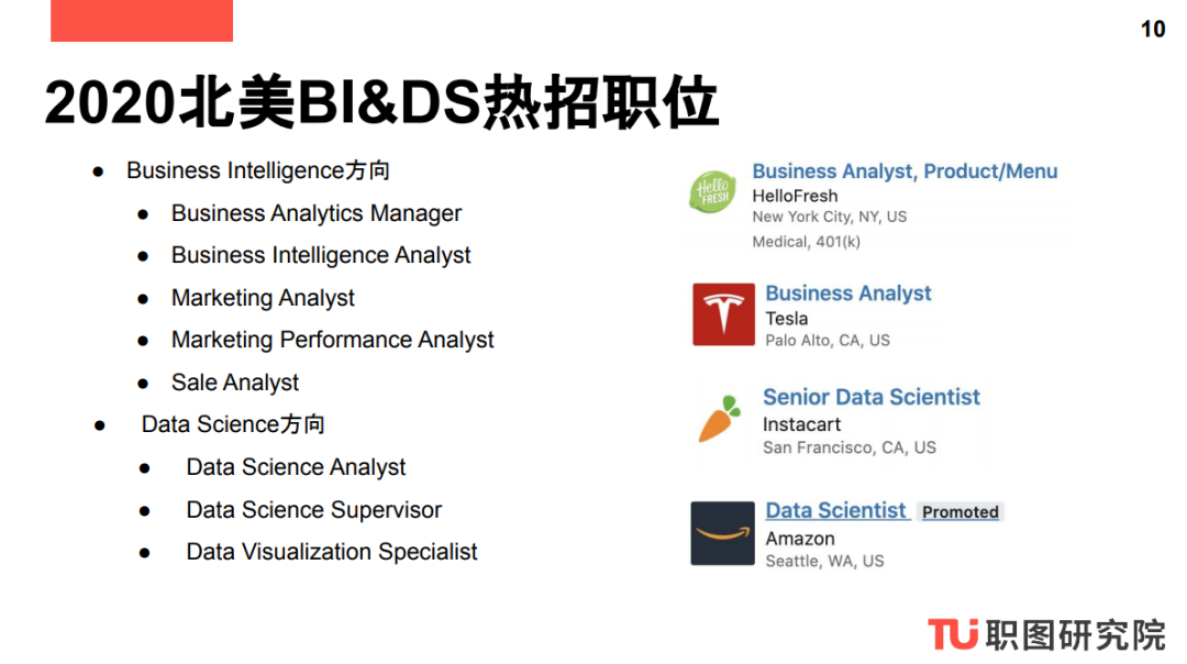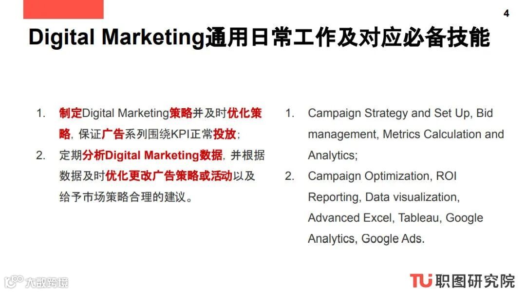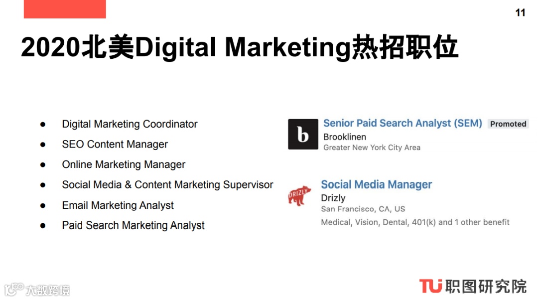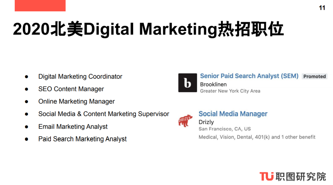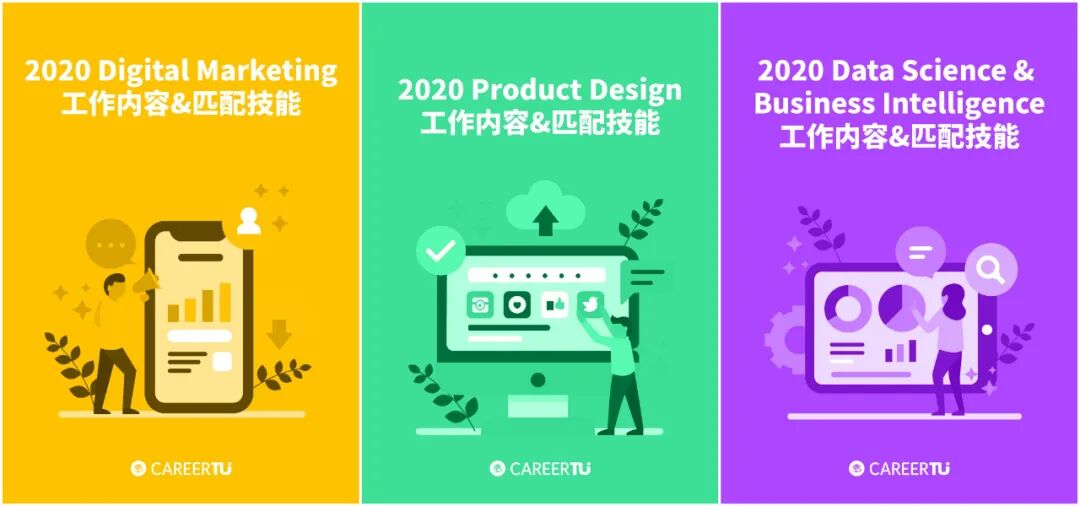 这一系列报告为商业分析、数据分析、数字营销和产品设计四大方向的求职者提供了日常工作内容参考以及完成相应工作必备的职业技能,方便求职者对应工作内容来进一步完善自己的Skill Set。这一系列报告报告还提供商业分析、数据分析、数字营销和产品设计四大方向常见职位参考以及2020北美公司正在热招的Digital Marketing职位,方便求职者申请。