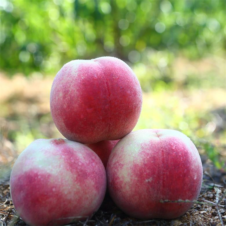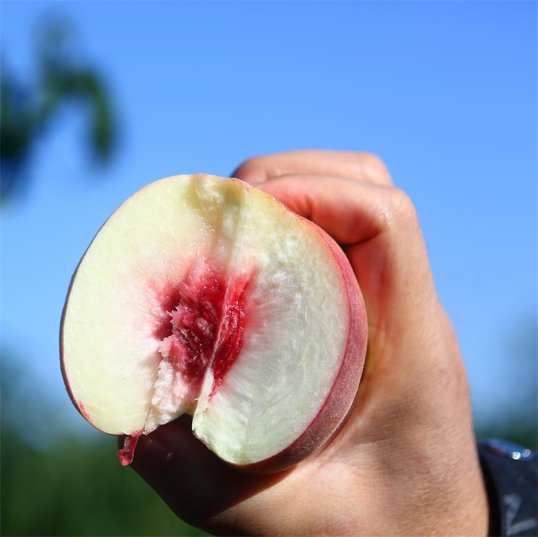 特早成熟的白肉毛蟠桃,潍坊地区六月五号左右即可采摘,平均单果重180克左右,最大可达400克,省工省时,不用套袋、摘袋,而且一般挑级不严格,非常畅销,盘径六厘米左右,平整,果顶愈合完整,无裂口疤痕,果肉厚实、紧密,糖度在15度,在所有的蟠桃中是最丰产的,而且极耐运输。