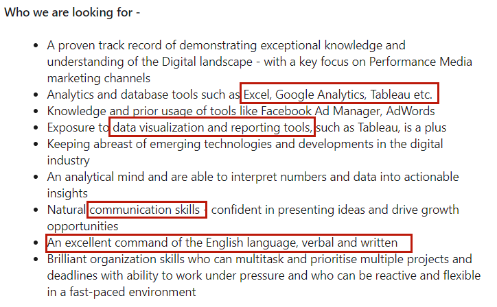 Campaign Optimization, ROI Reporting, Data visualization, Advanced Excel, Tableau, Google Analytics, Google Ads.