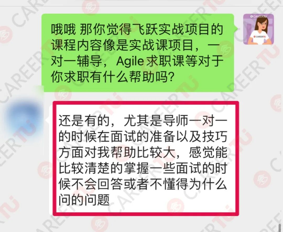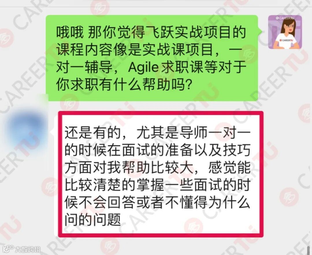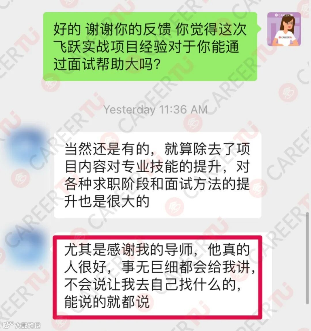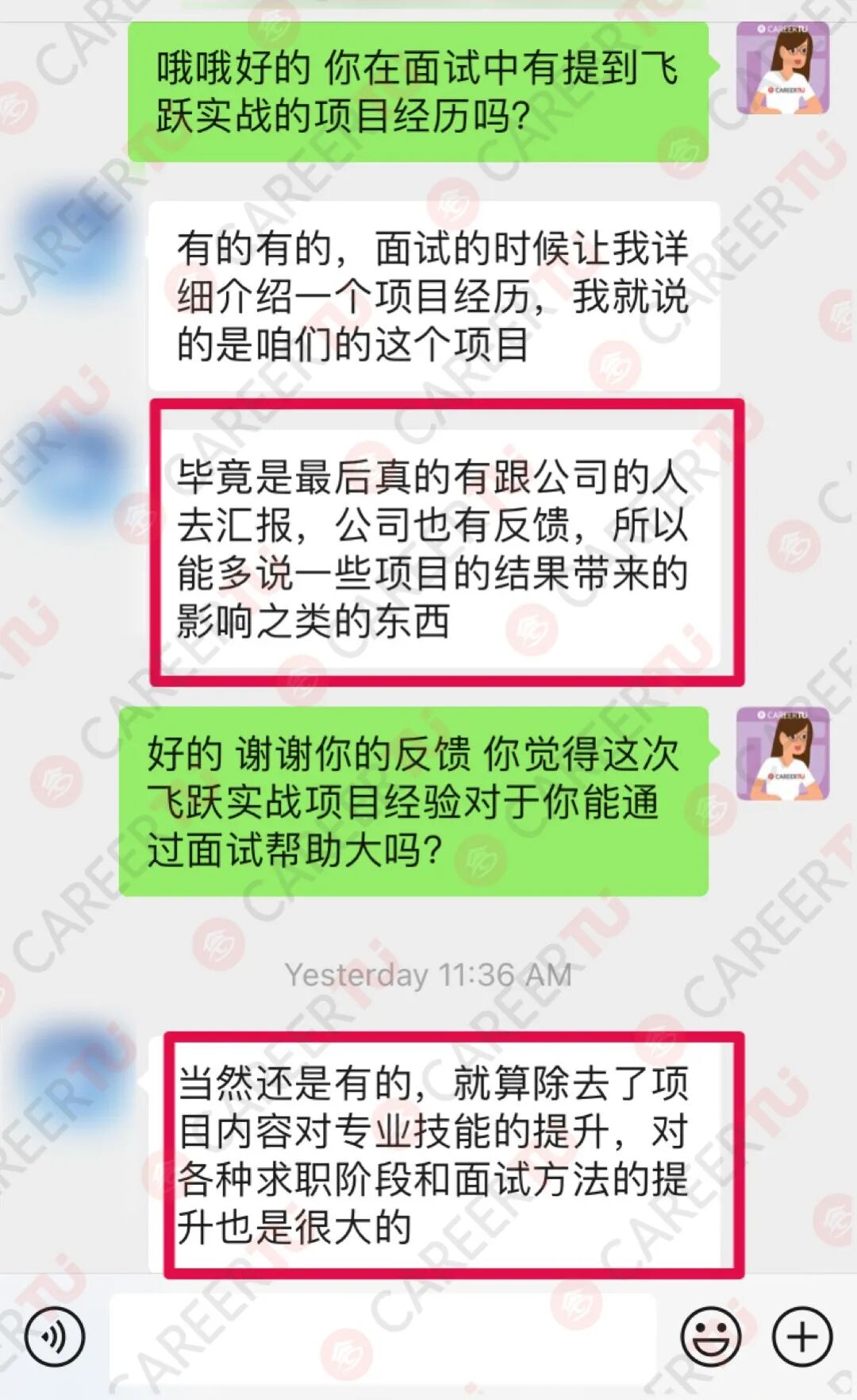 T学员反馈这次飞跃实战的项目经历不仅帮助他提升了数据科学领域的专业技能,也在项目最后跟公司负责人进行了汇报,得到了公司反馈,了解了实战项目的结果对于公司的影响。在面试中有真实的实战项目经历可以讲述。