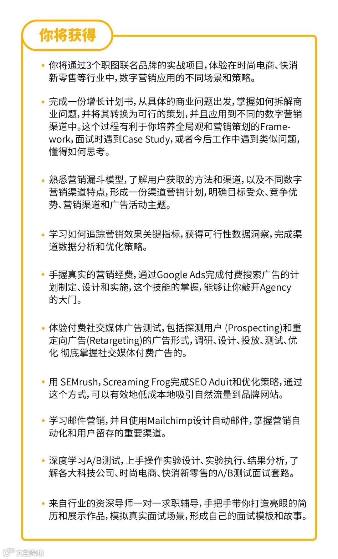 从SEO, Paid Social, Google Analytics, Email Marketing, Web Analytics等多个知识体系传授硬技能,并且掌握用户分析、用户获取、用户激活、流程与传播,同时获得一份真实的商业项目实操经历!