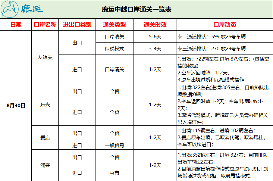 8月30日中越边境口岸最新通关资讯