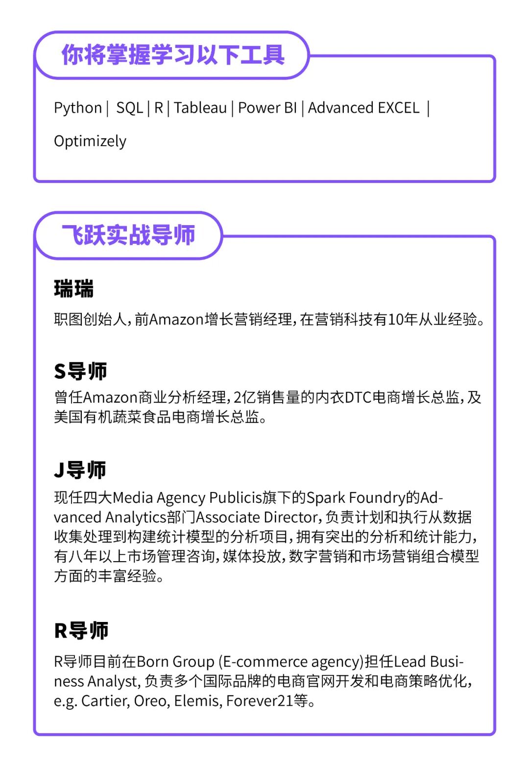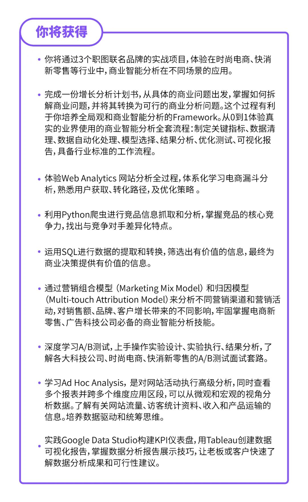 在实战周期中,学员将会在来自Amazon, Facebook, L'Oréal, LVMH, Casper 等领先公司的业界资深导师的带领下,体系化学习Marketing Analytics必备技能和工具,提升商业敏感度。通过学习分析指标、分析模型、数据可视、大数据分析,Technical+Non-techinical Skills双管齐下,并且掌握深刻了解指标定义、数据挖掘、数据分析以及可视化报告在商业实操中的应用,同时获得一份真实的商业项目实操经历!