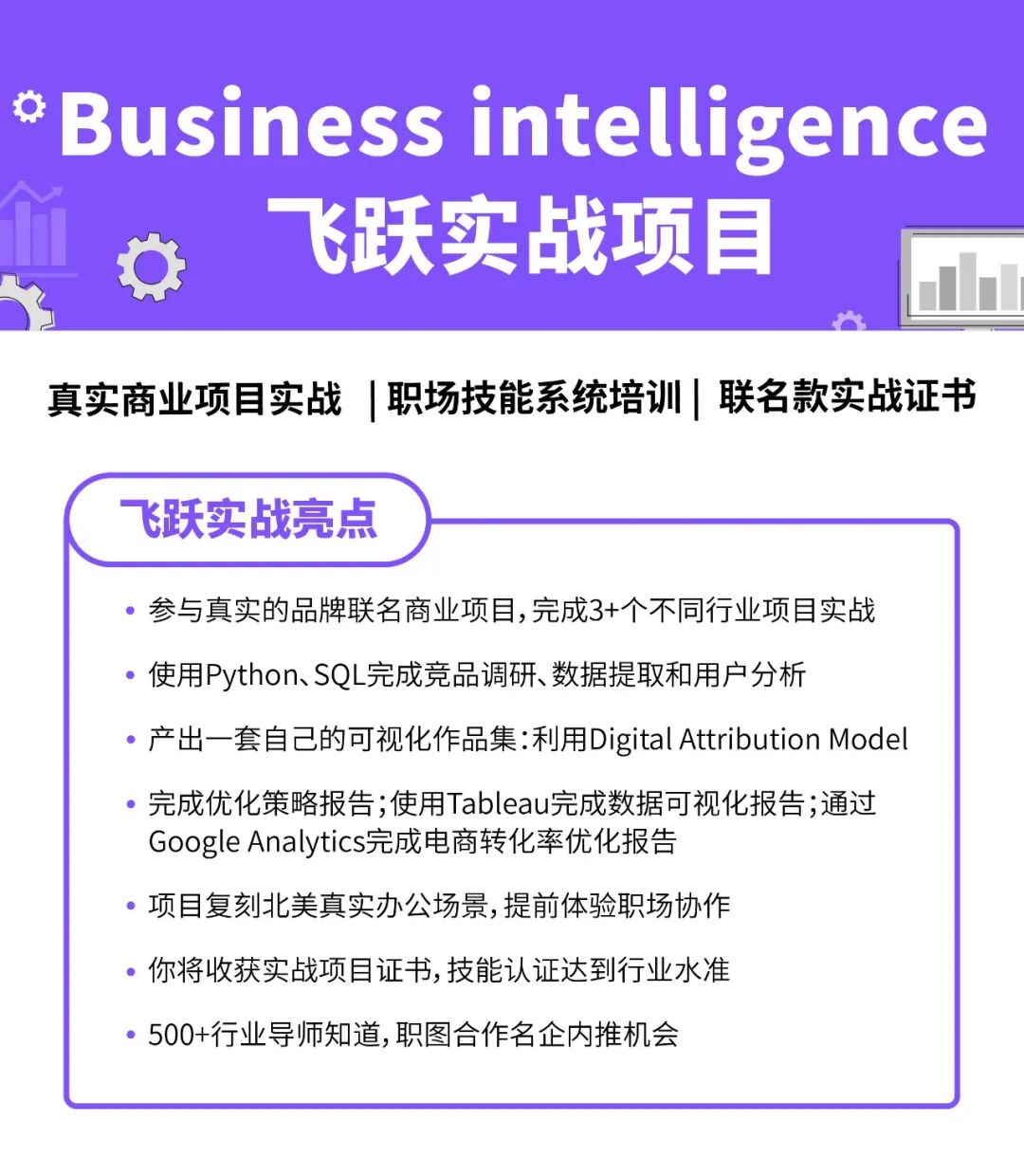 职图飞跃实战Business Intelligence方向2020年度最后一期全球招生,最后报名机会!职图飞跃实战的学员,将在6个月的时间内,通过实战联名款真实商业项目,与各个部门相互合作,共同完成联名款产品网页搭建、营销推广和投放、商业智能分析及数据分析、优化的全过程,充实你简历的项目经历、让你面试不怵。