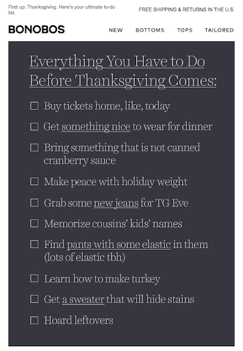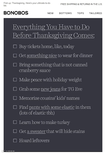 Bonobos则列出了一个感恩节假期待办事项清单,通过邮件发送给用户,让他们开始提前做准备。清单内容非常巧妙地推荐了Bonobos产品,这个清单对于还处于节日迷茫中的用户,可以说是非常有帮助。