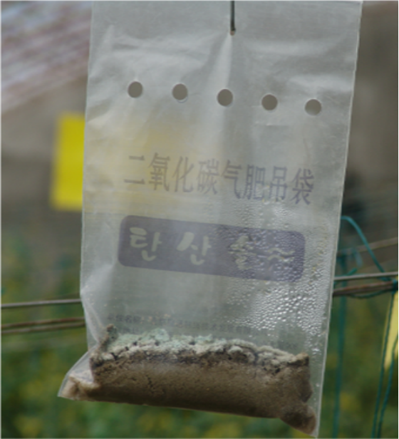 采用吊袋式二氧化碳气体发生剂进行二氧化碳施肥,一般亩用量20袋,均匀悬挂作物上方,对于高秧蔬菜要距离植株生长点30厘米以免产生肥害,每隔30天更换1次。