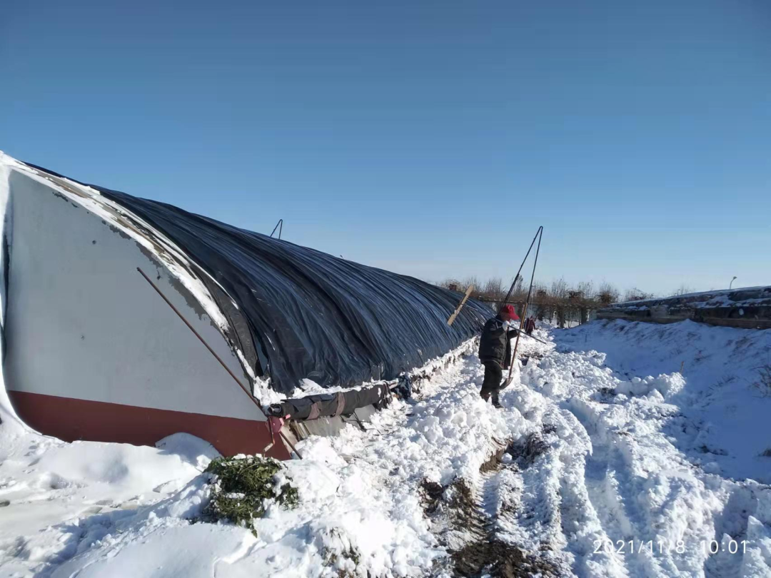 为防积雪造成设施结构损坏,可采用长把刮板、大功率吹风机或人工扫雪等方式,及时做好棚体积雪清除,并保障积雪不要堆积在温室前地脚外侧。