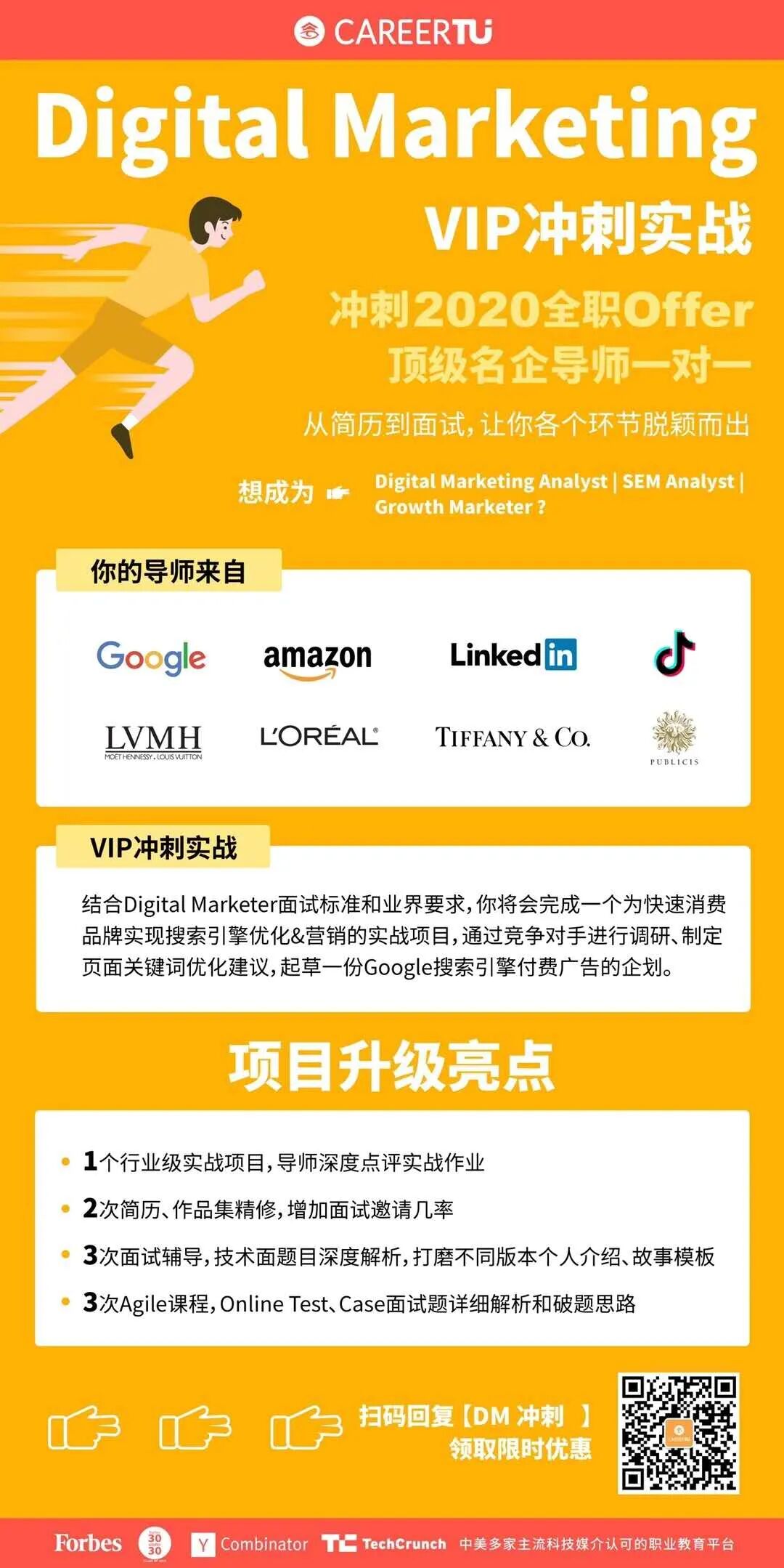 职图Digital Marketing VIP冲刺实战项目,旨在填补学校与企业间的知识以及技能的鸿沟。全面学习Digital Marketing 方向的细分课程, 在最短时间内,从知识框架(Fundamentals),必备技能(Skill set),到行业趋势发展(Trend)等多个板块帮你打通入行壁垒。同时根据学员背景和求职目标,匹配合适的一对一导师,手把手带着学员突破简历、面试的层层关卡!