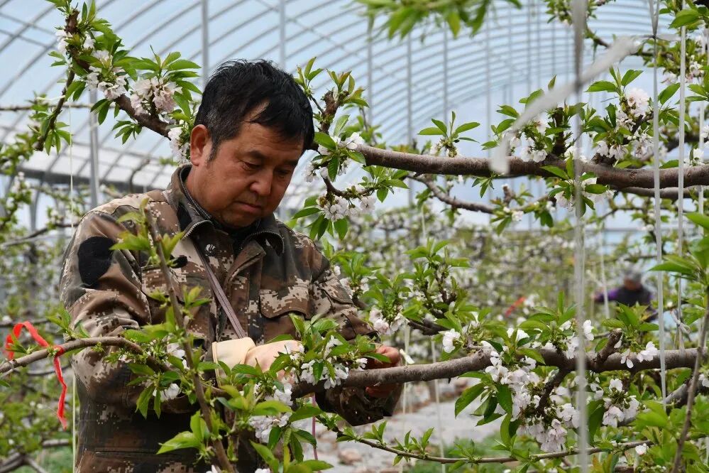 △杨凌当地农民在给樱桃授粉(新华社记者张斌 摄)
