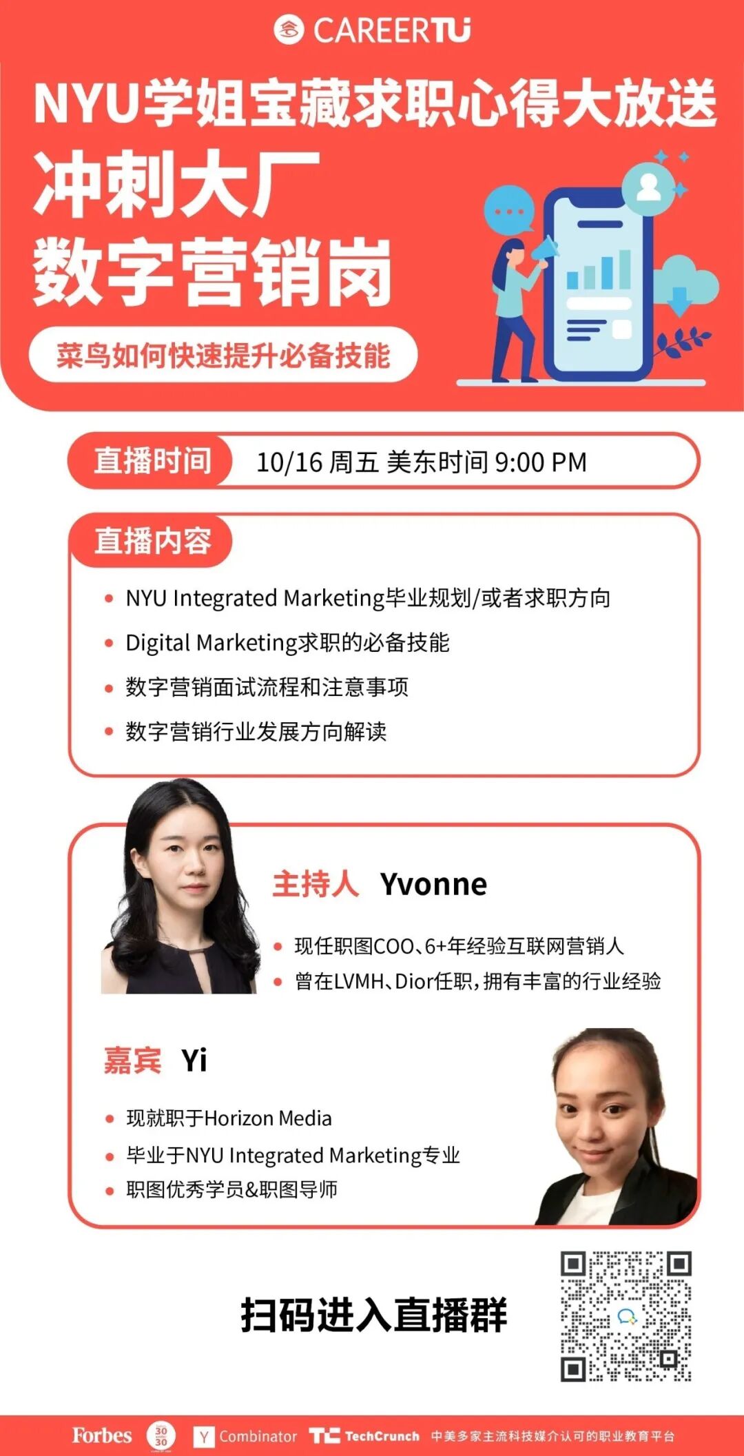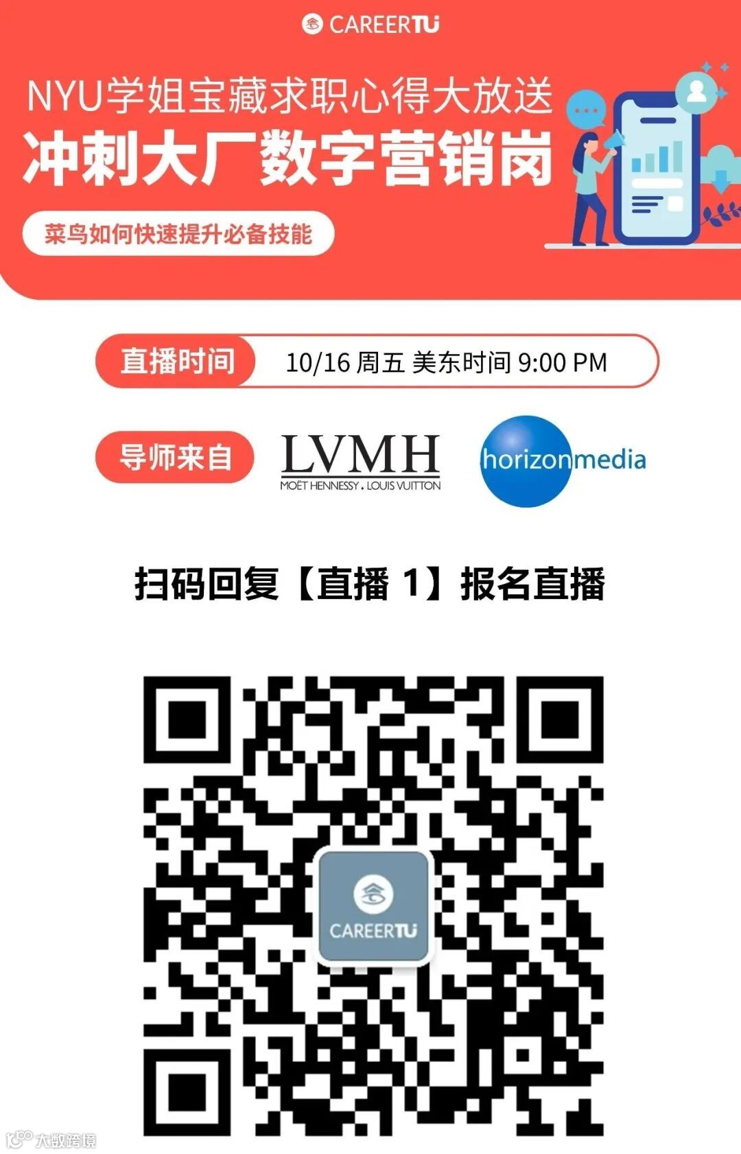 今天故事的主人公(也是上图10/16讲座的分享嘉宾)--NYU学姐Yi,也有着这样的问题。但是,她还是在2个月时间内,成功获得了全球顶尖广告集团 Omnicom Group 旗下公司 Hearts & Science 的全职 Offer。