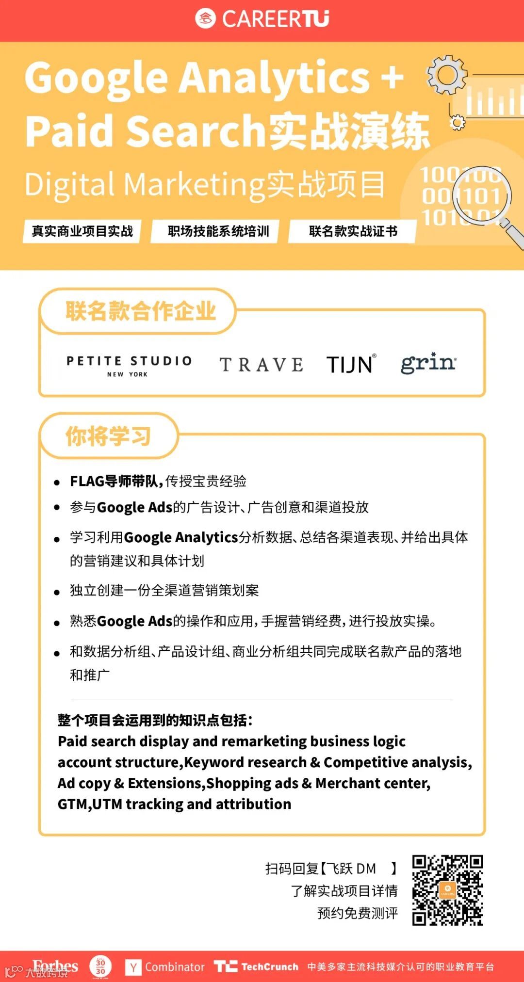 从SEO, Paid Social, Google Analytics, Email Marketing, Web Analytics等多个知识体系传授硬技能,,并且掌握用户分析、用户获取、用户激活、流程与传播,同时获得一份真实的商业项目实操经历!