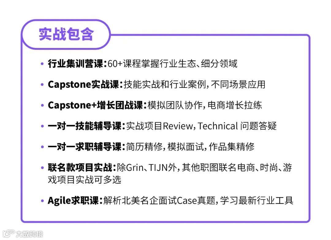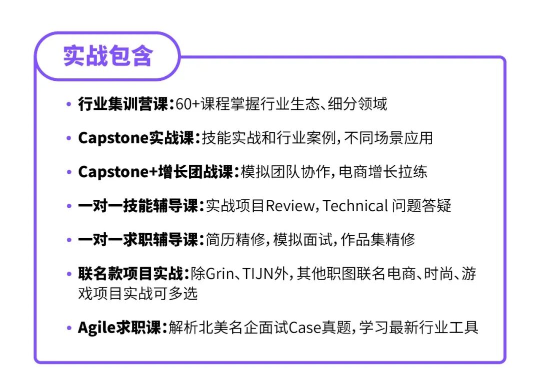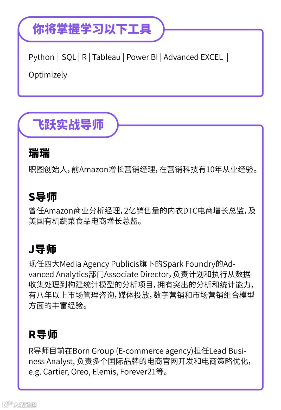 职图飞跃实战的学员,将在6个月的时间内,通过实战联名款真实商业项目,与各个部门相互合作,共同完成联名款产品网页搭建、营销推广和投放、商业智能分析及数据分析、优化的全过程,充实你简历的项目经历、让你面试不怵。