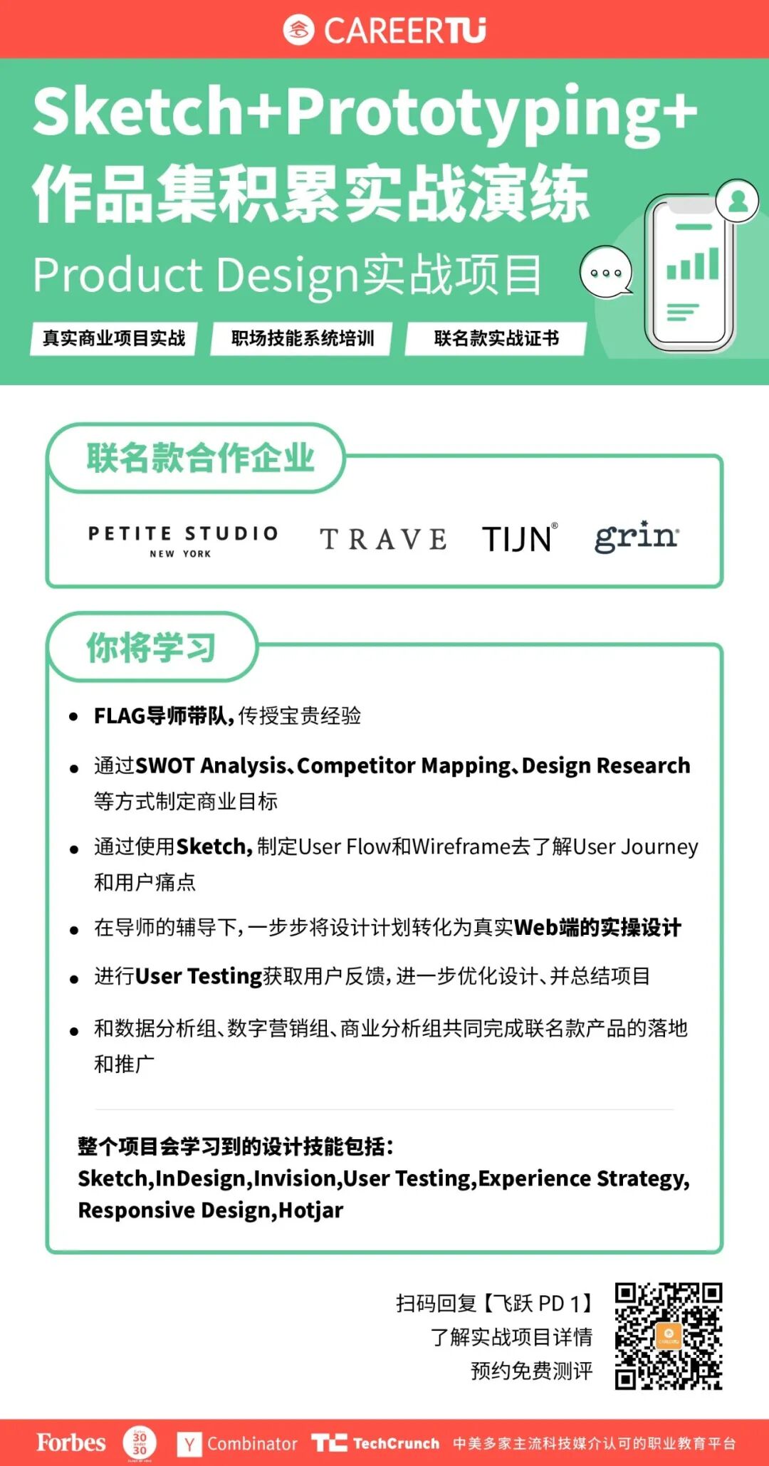 职图Product Design飞跃实战的学员,将在6个月的时间内,通过实战联名款真实商业项目,学会掌握行业高薪技能!通过SWOT Analysis、Competitor Mapping、Design Research等方式制定商业目标,熟练掌握Sketch等必备工具应用。从Wireframing、Prototyping、Research Skills、Customer Analytics等多个知识体系传授硬技能。和数字营销组、商业分析组、数据分析组相互合作共同完成联名款产品落地和推广。