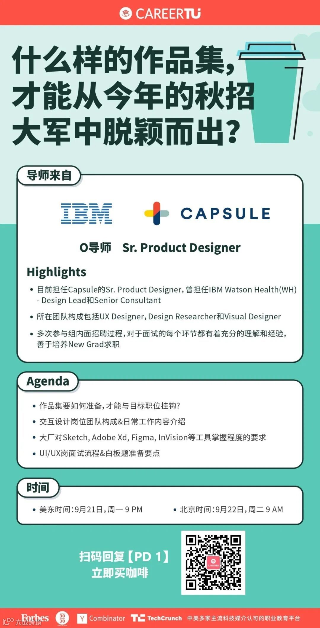 本月我们邀请到曾任IBM Watson Health(WH)- Design Lead和Senior Consultant,目前担任Capsule的Sr.Product Designer的O导师为大家解析今年秋招怎样的作品集才能脱颖而出。