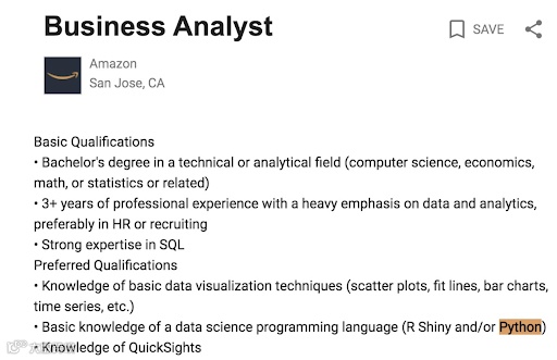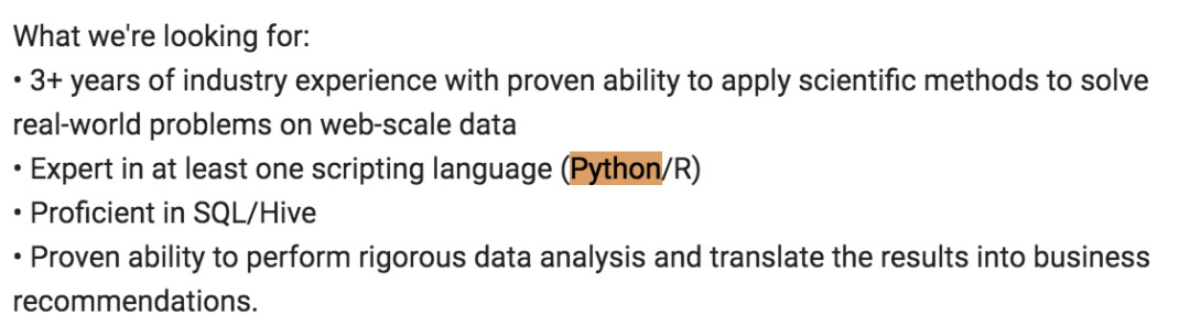因此,像Amazon、Wayfair、阿里、京东这样的电商公司,在招聘数据分析岗位时,都会要求申请人擅长Python、R、SQL这样的语言工具。