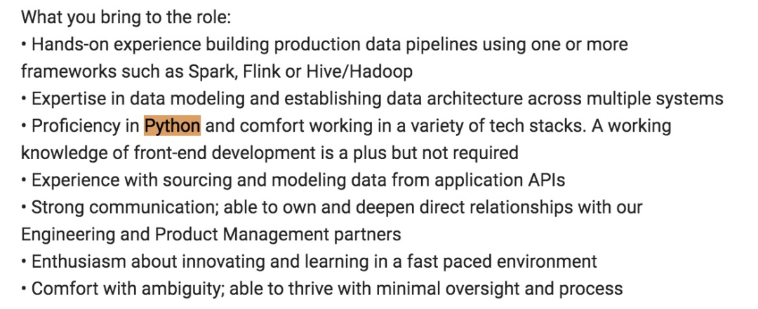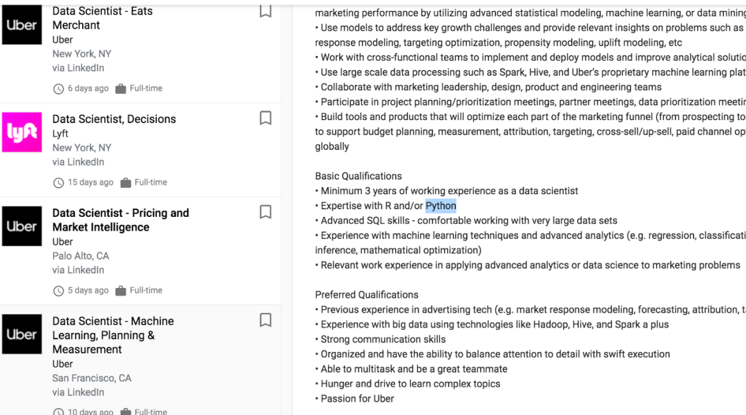 许多互联网科技公司,都将推荐算法作为自己的核心技术,因此对于数据岗的人才需求非常大,提供的薪资待遇和在公司的话语权,也是可以和程序开发岗位职能相比拟。打开求职网站,Opening Positions 非常多,而Python几乎会出现在每一个数据岗的Job Description 上。