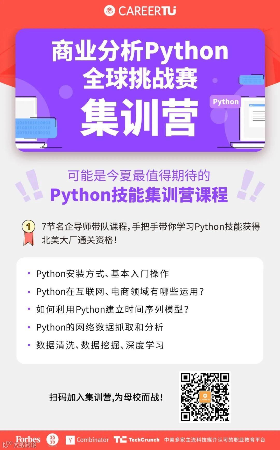 职图数据分析Python集训实战等你加入!在集训课程,你将学习数据分析应用的商业逻辑、必备的工具和建模,掌握Python、SQL、MapReduce、Tableau数据分析工具,及网页抓取、XML解析、图像特征提取、图像风格化、推荐系统、自然语言处理、深度学习、卷积神经网络等数据分析技能。完成所有课程并且成功闯关7个Python挑战赛关卡后,将掌握基本Python常用技能和应用场景,具备申请数据科学或商业智能分析方向岗位工作的竞争力!