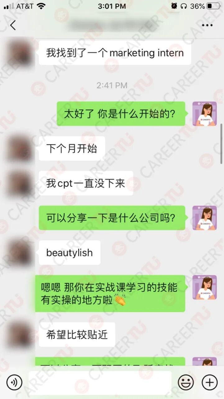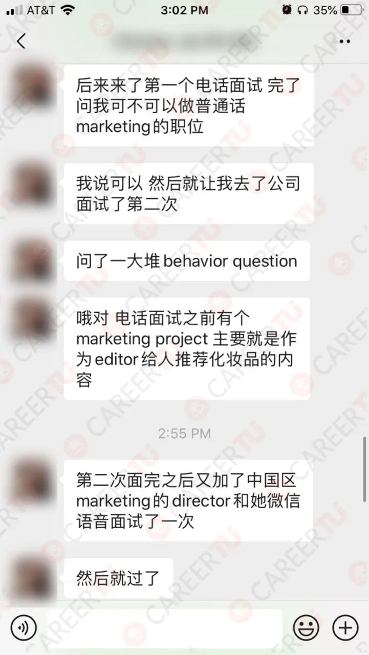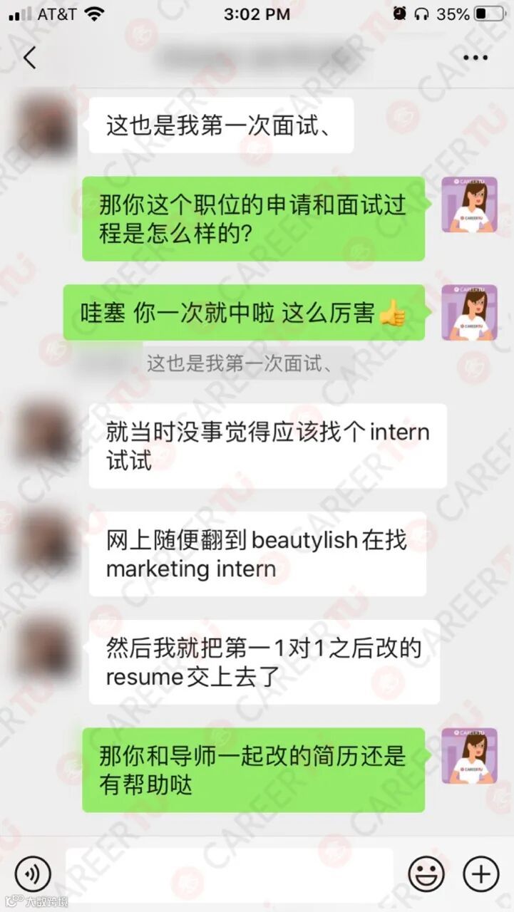 同时C学员也分享了她这次面试经历:她把跟导师一对一改过的简历提交后就收到了电话面试的邀请,在电话面试前需要完成一个Marketing Project,内容是化妆品推荐相关的营销内容编辑和审核。她在接下来的公司Onsite面试中被问了很多行为面试问题。最后一轮面试是与中国区的Marketing Director。最终C学员通过自身的努力,和与职图教学组老师的密切配合下,拿到了这个实习Offer!希望C学员接下来有更好的职业发展。