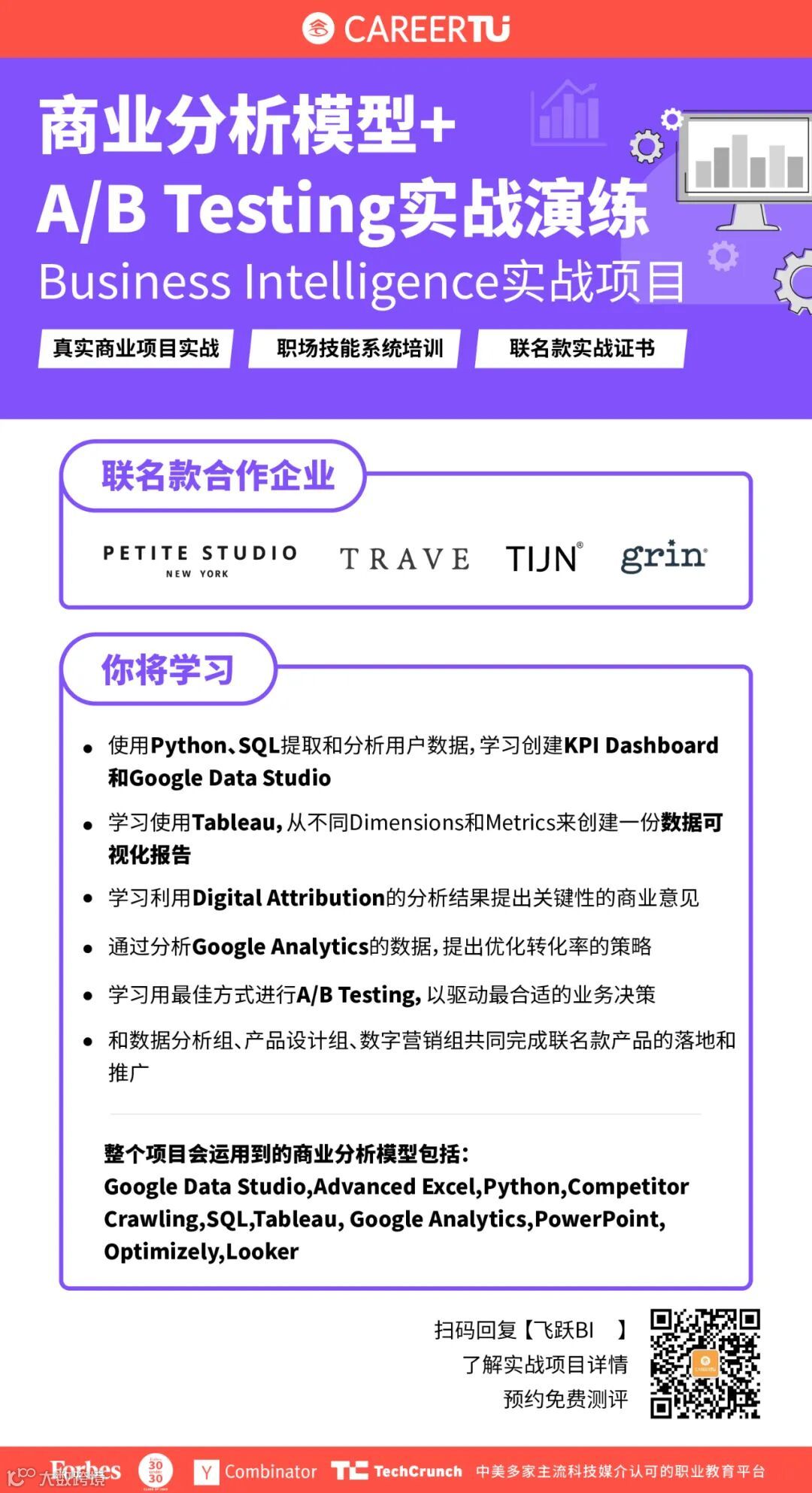 职图飞跃实战的学员,将在6个月的时间内,通过实战联名款真实商业项目,与各个部门相互合作,共同完成联名款产品网页搭建、营销推广和投放、商业智能分析及数据分析、优化的全过程,充实你简历的项目经历、让你面试不怵。