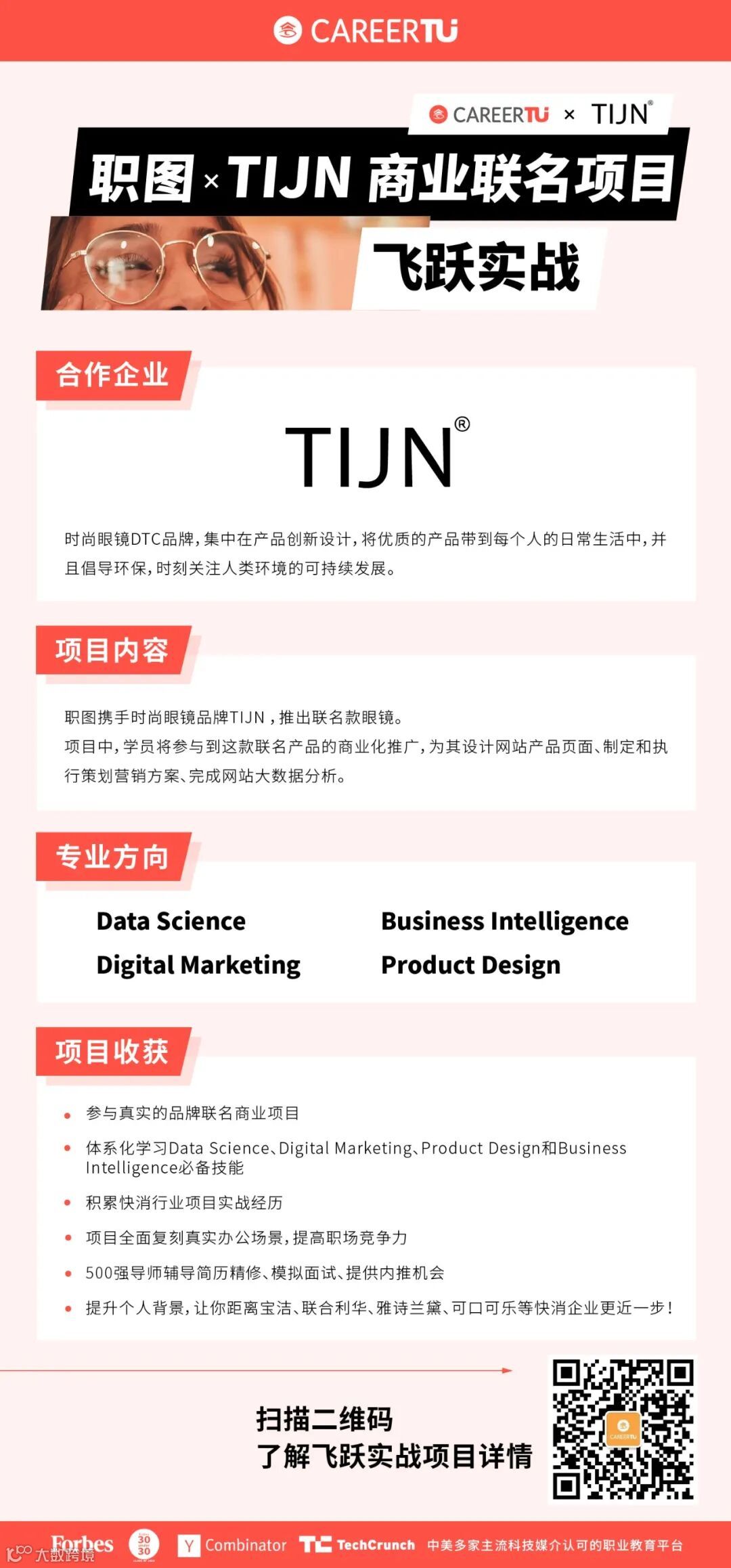 此前,飞跃实战已经与纽约时尚电商Petite Studio、加州时尚设计师品牌Trave等企业推出联名款实战,此次职图与TIJN的合作飞跃实战项目也正式面向Digital Marketing、UIUX Design、Data Science、Business Intelligence四个方向的同学开启全球限量招生!