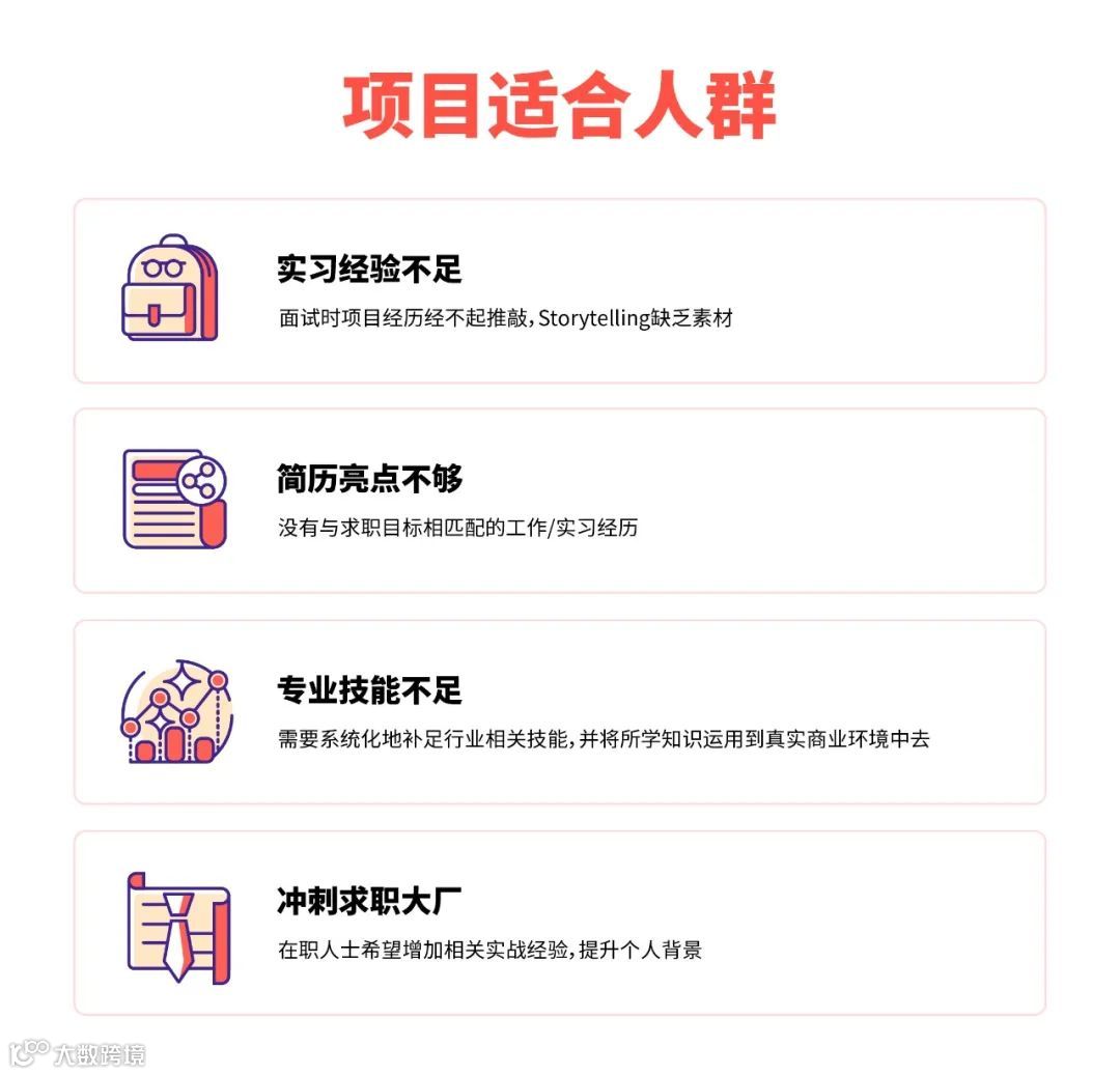 职图飞跃实战的学员,将在6个月的时间内,通过实战联名款真实商业项目,与各个部门相互合作,共同完成联名款产品网页搭建、营销推广和投放、商业智能分析及数据分析、优化的全过程,充实你简历的项目经历、让你面试不怵。