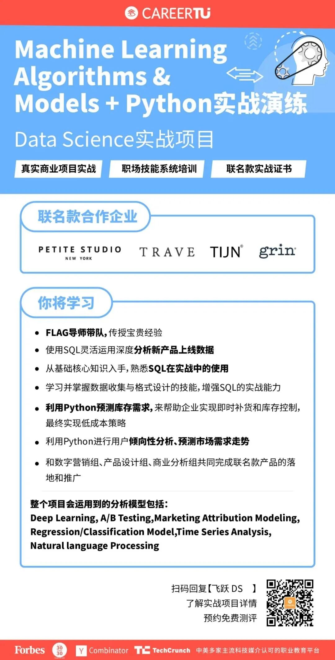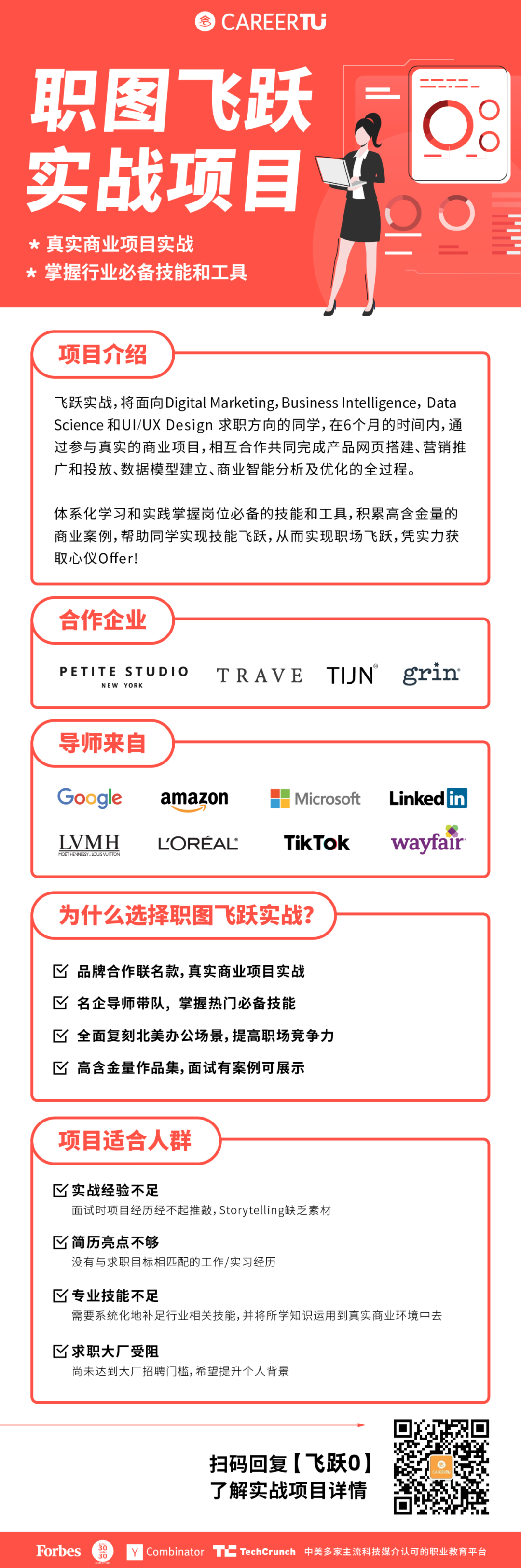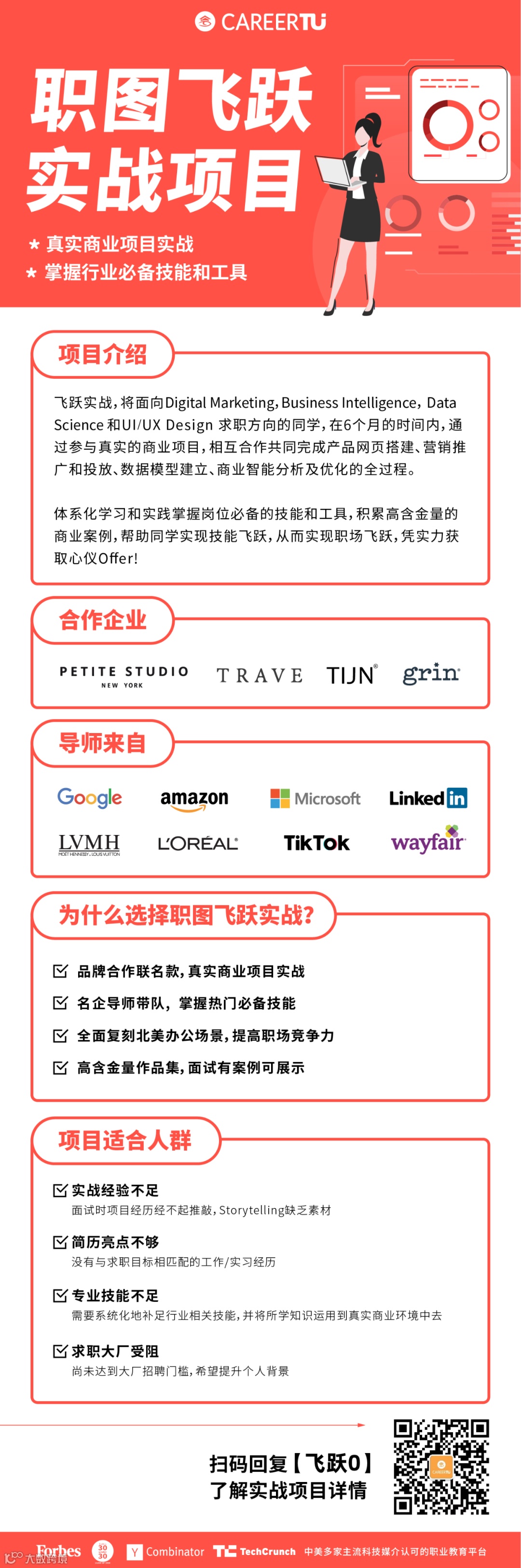 职图飞跃实战的学员,将在6个月的时间内,通过实战联名款真实商业项目,与各个部门相互合作,共同完成联名款产品网页搭建、营销推广和投放、商业智能分析及数据分析、优化的全过程,充实你简历的项目经历、让你面试不怵。