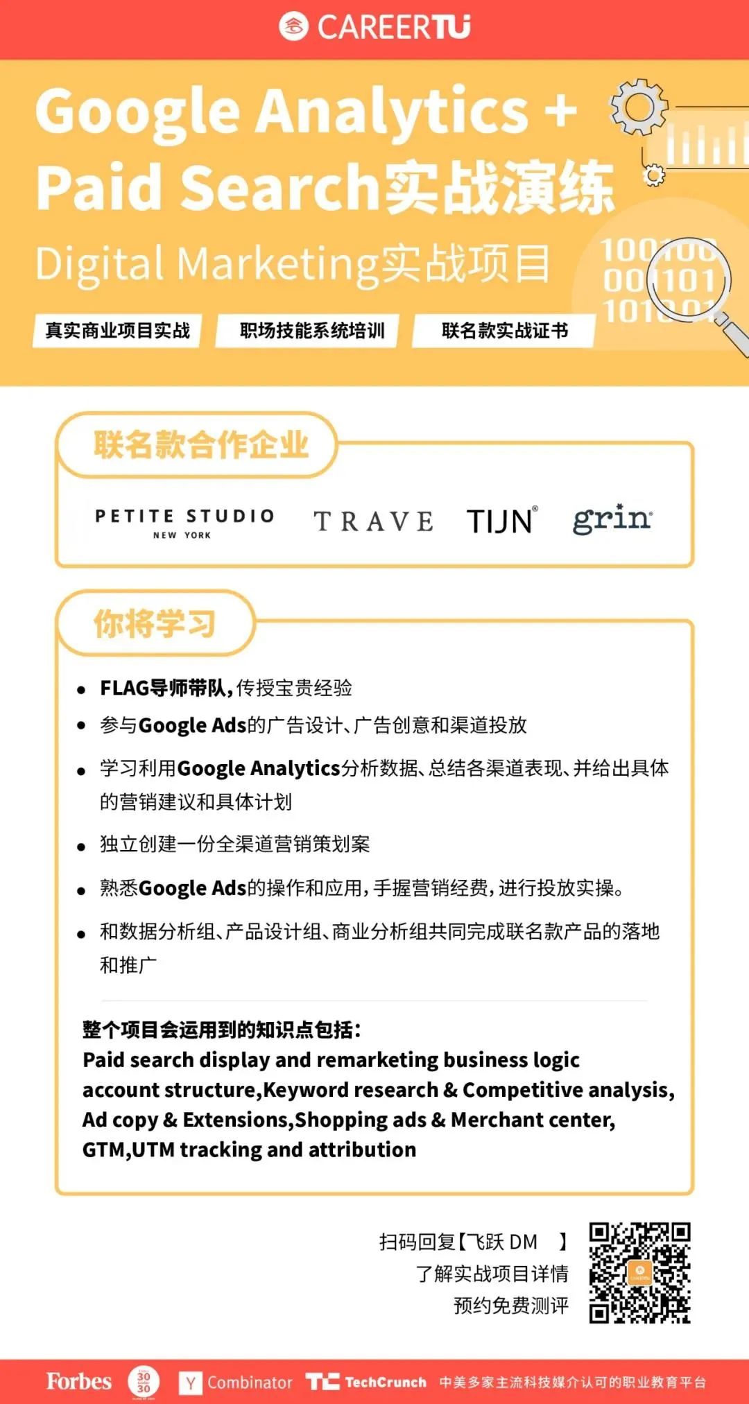 课程旨在帮助在校学生、毕业求职者和在职工作人士学习掌握互联网热门行业硬技能,知识点涵盖SQL、Python、Google Analytics、Google Ads、Tableau、Mailchimp 、Sketch等。