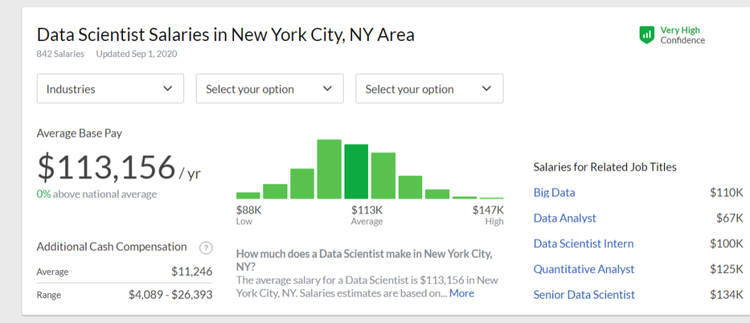 根据Glassdoor在2019年末出具的美国薪酬排行报告显示,作为近5年正在快速发展的职业。今年数据科学家的被排在排在第22位,平均工资为113,156美元。