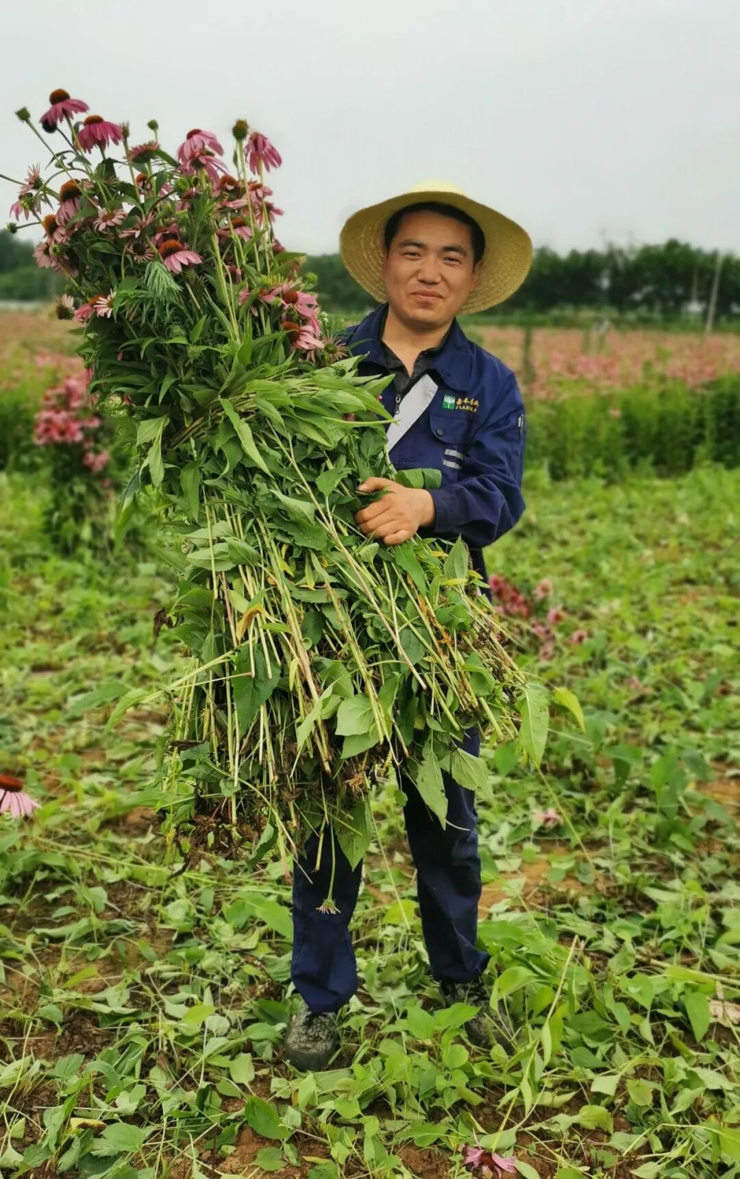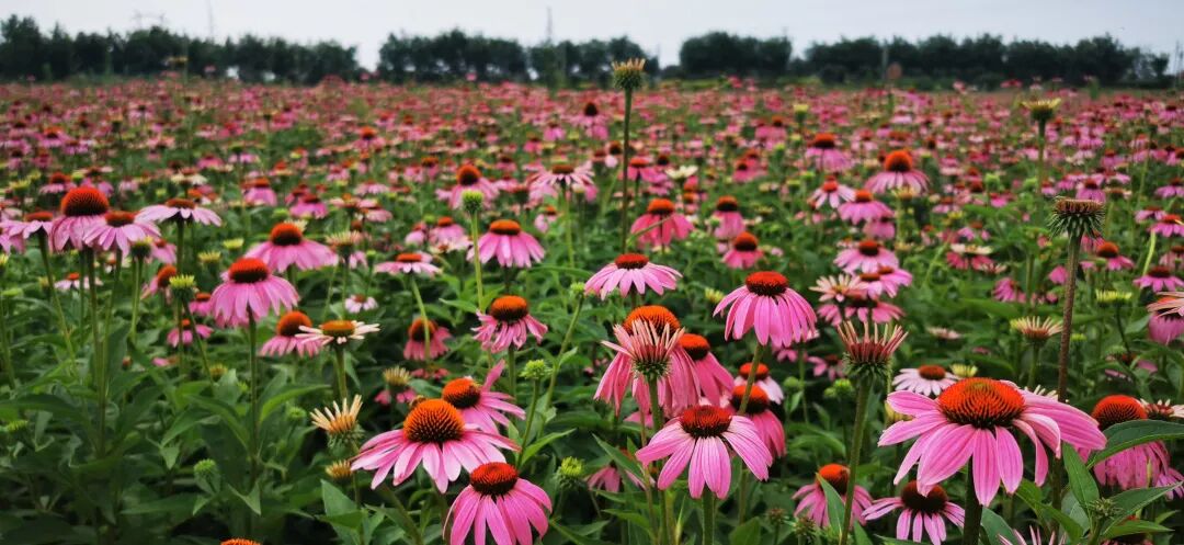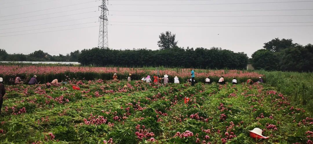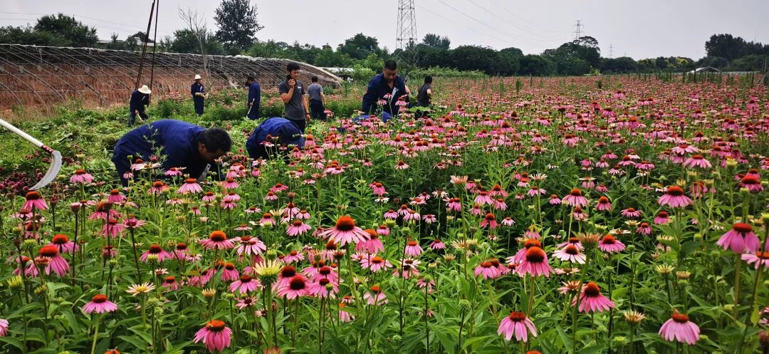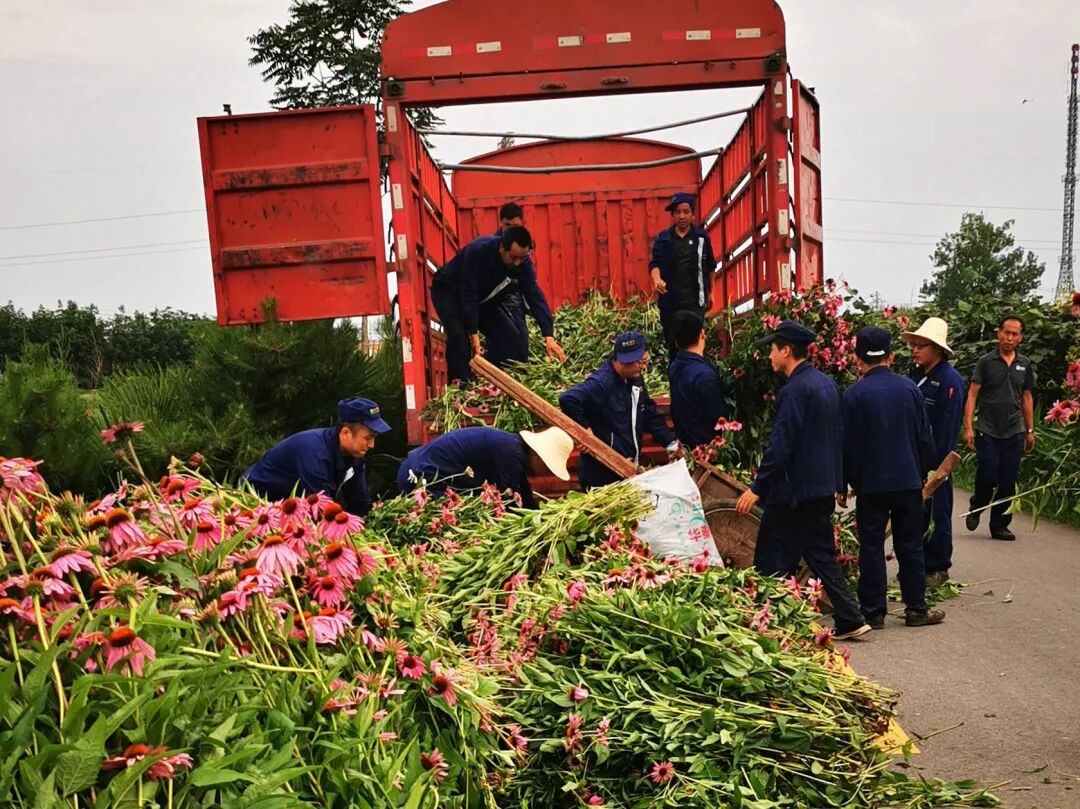 在崔家寨村紫锥菊药材种植基地,满地的紫锥菊如红毯一般在田间绽放,村民们有的收割、有的搬运、有的装车,一派繁忙景象。