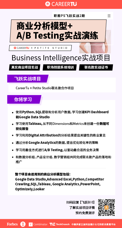 职图飞跃实战的学员,将在6个月的时间内,通过实战联名款真实商业项目,与各个部门相互合作,共同完成联名款产品网页搭建、营销推广和投放、商业智能分析及数据分析、优化的全过程,充实你简历的项目经历、让你面试不怵。