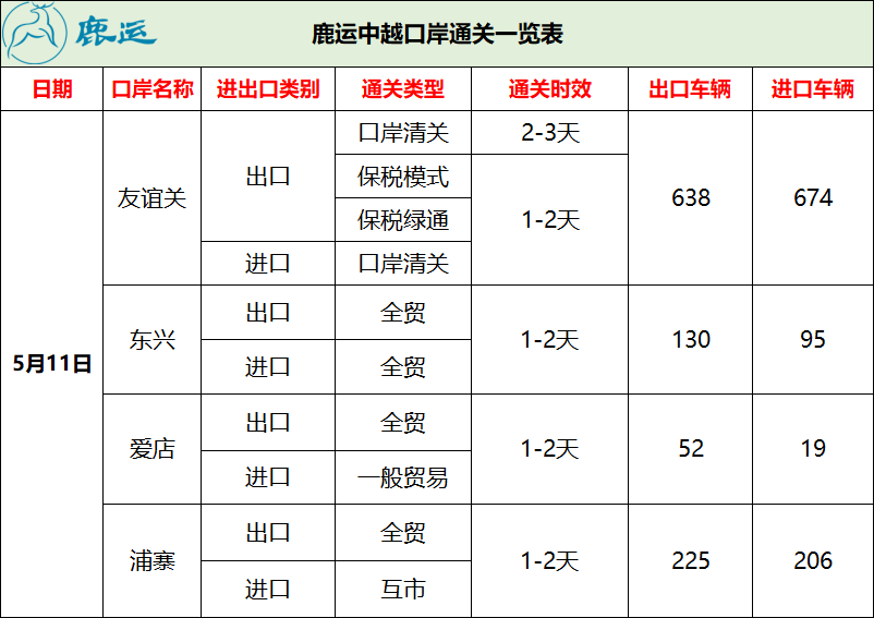 东兴恢复原车原司机车境,5月11日,东兴进出口车辆一共225辆,其中出口130辆,进口95辆,进出口时效为1-2天。