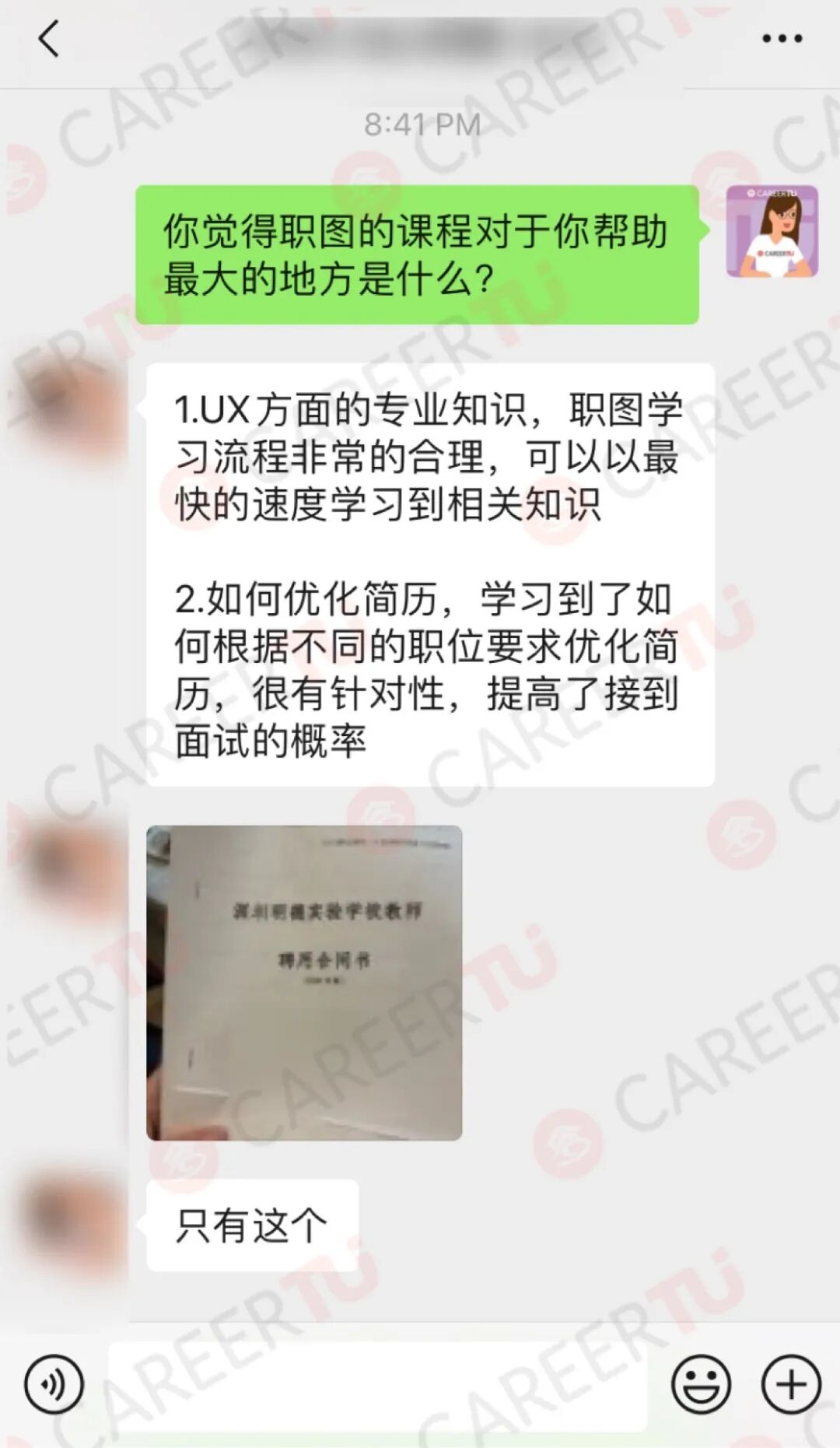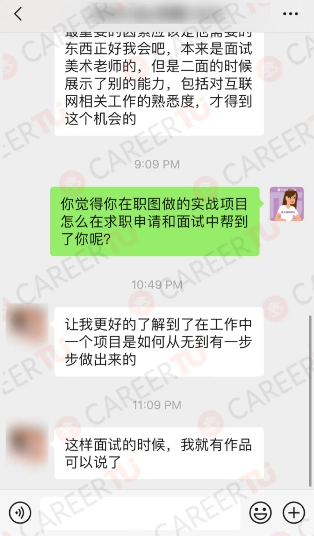 S学员分享到职图的课程对于她帮助最大的地方就是不仅快速学习了行业相关知识,而且学习了如何根据不同的职位要求,来有针对性地优化简历、准备其它申请材料,提升了她拿到面试的几率。
