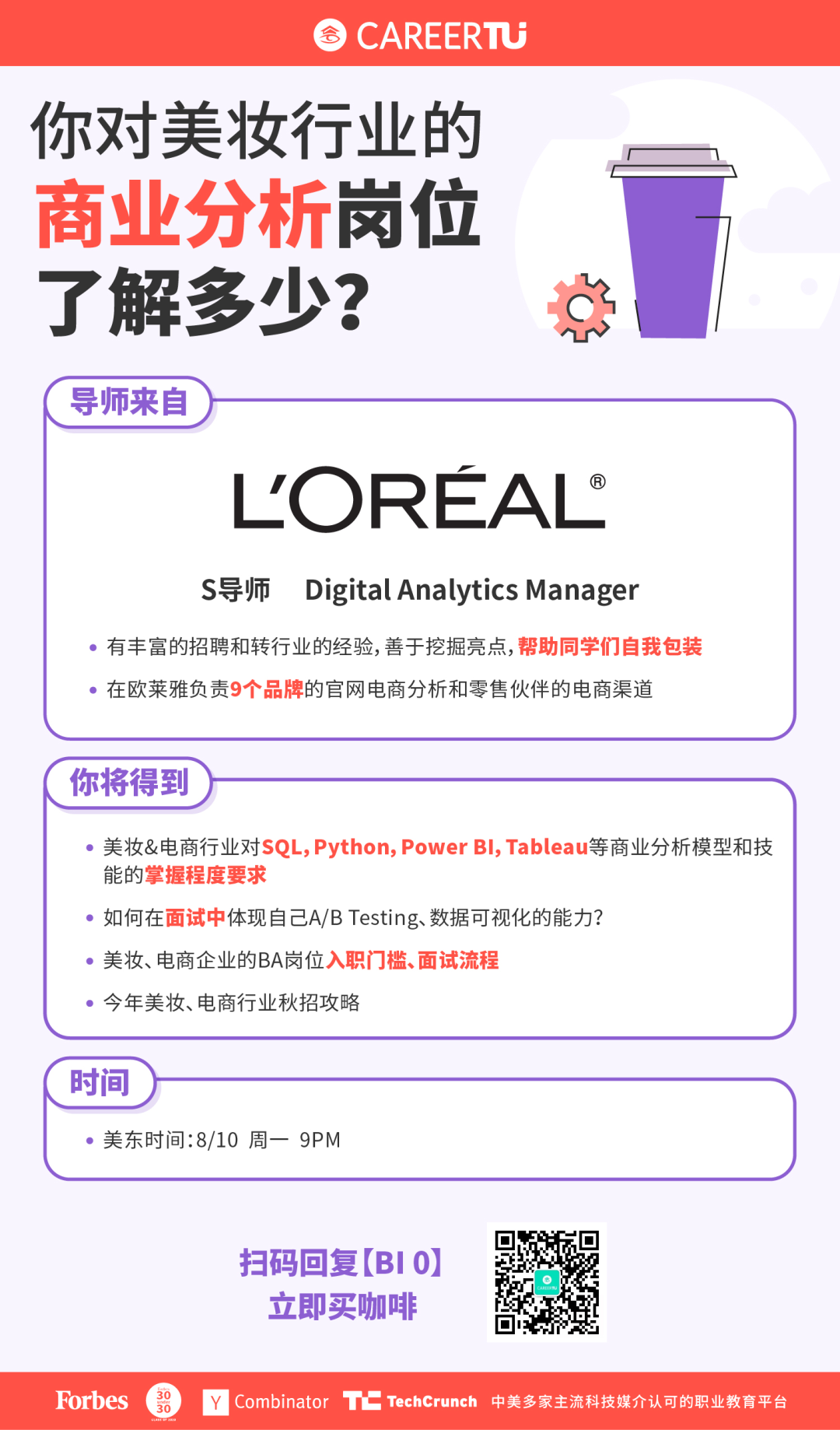 想要了解更多美妆行业Business Intelligence岗位工作内容、求职重点技能,你可以参加职图线上云咖啡讲座Business Intelligence专场。