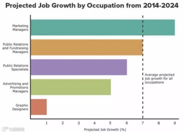 根据美国劳工统计局(U.S. Bureau of Labor Statistics)的数据,到2022年,全美预计新增24,000个 Marketing 相关职位,其中,Marketing Manager 不仅有高于其他市场岗位的显著增长,同时也是全美排名第13的高薪职位(By US News and World Report)