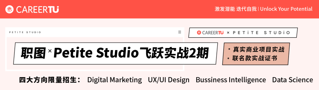 职图×Petite Studio飞跃实战,面向Digital Marketing、UIUX Design和Business Intelligence,Data Science四个求职方向的同学招生!参加计划的学员在6个月的时间内,通过参与真实的商业项目,相互合作共同完成联名款产品网页搭建、营销推广和投放、商业智能分析及数据分析、优化的全过程。