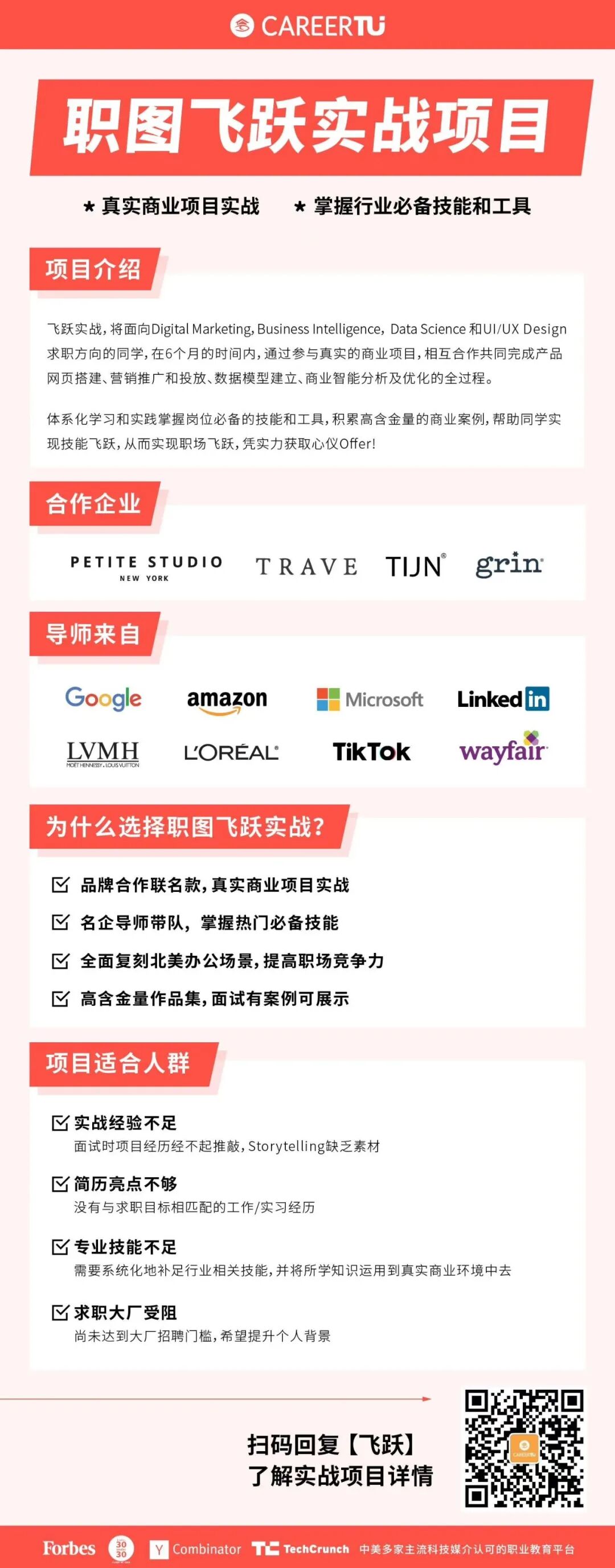 职图飞跃实战面向Digital Marketing、UIUX Design和Business Intelligence,Data Science四个求职方向的同学招生!参加项目的学员在6个月的时间内,通过参与真实的商业项目,相互合作共同完成联名款产品网页搭建、营销推广和投放、商业智能分析及数据分析、优化的全过程。