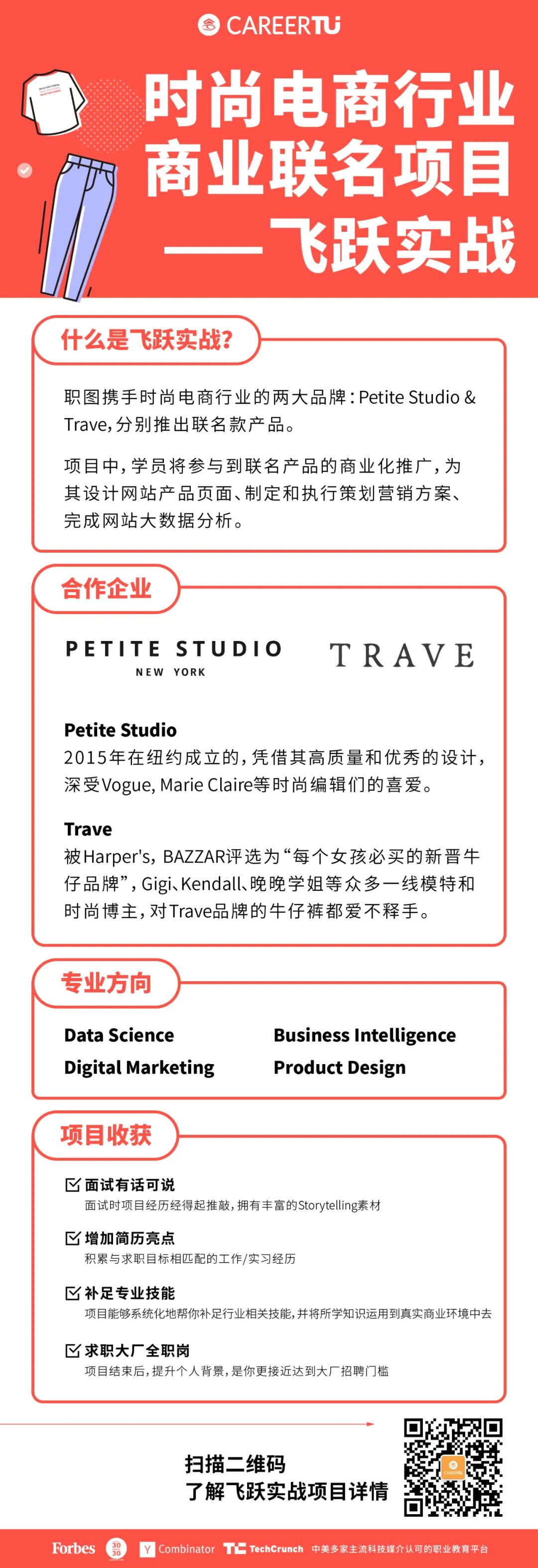 职图飞跃实战,面向Digital Marketing、UIUX Design和Business Intelligence,Data Science四个求职方向的同学招生!参加计划的学员在6个月的时间内,通过参与真实的商业项目,相互合作共同完成联名款产品网页搭建、营销推广和投放、商业智能分析及数据分析、优化的全过程。