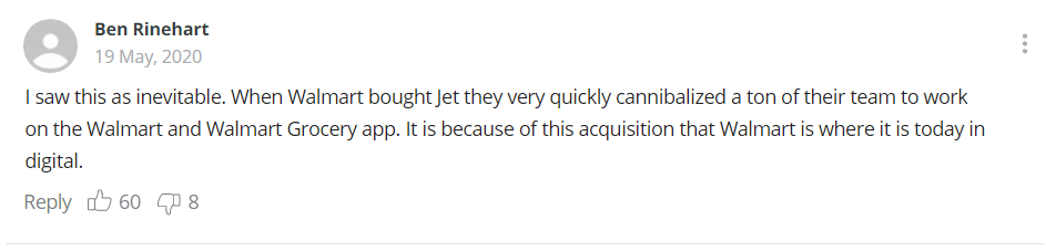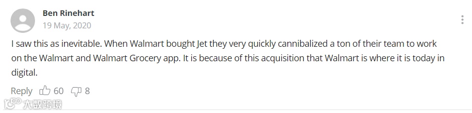 四年后的今天,沃尔玛在季度财报中轻描淡写地提了一句:““由于沃尔玛电商业务和品牌的持续强劲,我们将结束Jet.com的业务。不过这一品牌未来依然会再次启用。收购Jet.com对于加速沃尔玛的战略起到了关键的作用。”
