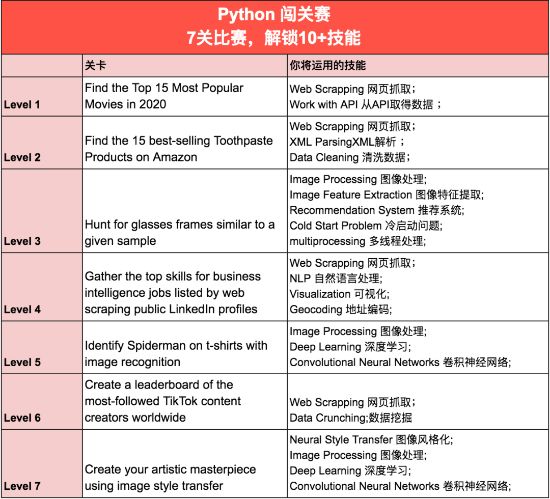 挑战赛的7个关卡,都是基于商业场景中,会使用的Python技能设计研发,包含Web Scrapping、Image Processing、Recommendation System 、NLP 、Neural Style Transfer等常用技能, 通过挑战赛,你能提升自己对Python的掌握程度,技术面更加有信心。