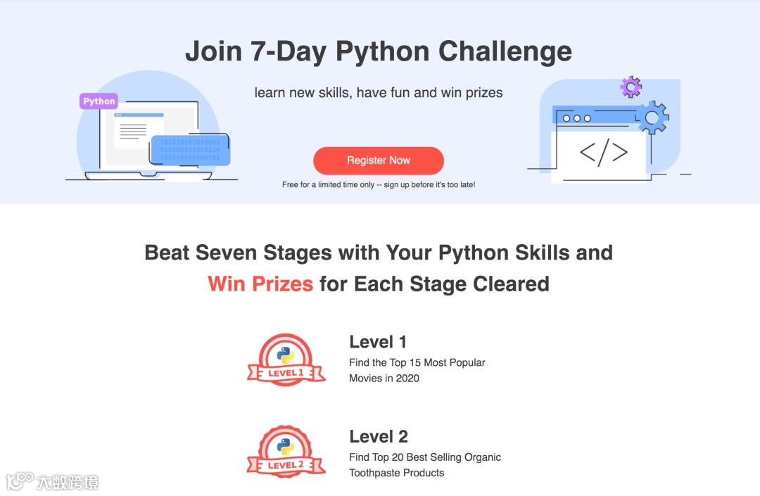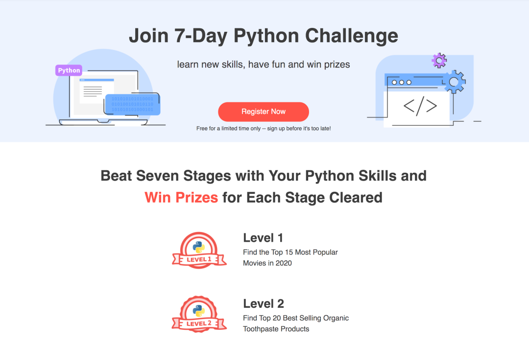7-Day Python 挑战赛,分为不同Level 1-7 的挑战赛,把在热门数据岗位中,会日常用到的Python技能融汇到每一个Level的挑战关卡中,让同学们通过游戏挑战的方式,由浅入深地锻炼自己的的Python技能,为申请高薪数据岗工作,打下坚实基础!