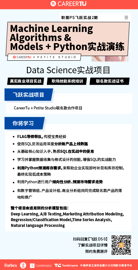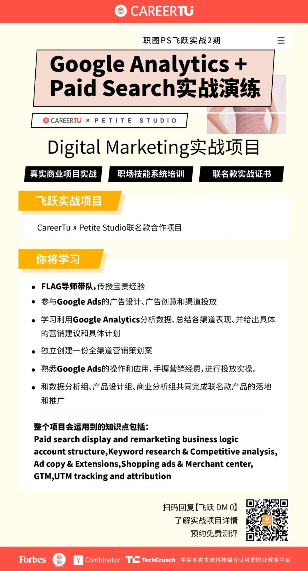 职图飞跃实战的学员,将在6个月的时间内,通过实战联名款真实商业项目,与各个部门相互合作,共同完成联名款产品网页搭建、营销推广和投放、商业智能分析及数据分析、优化的全过程,充实你简历的项目经历、让你面试不怵。