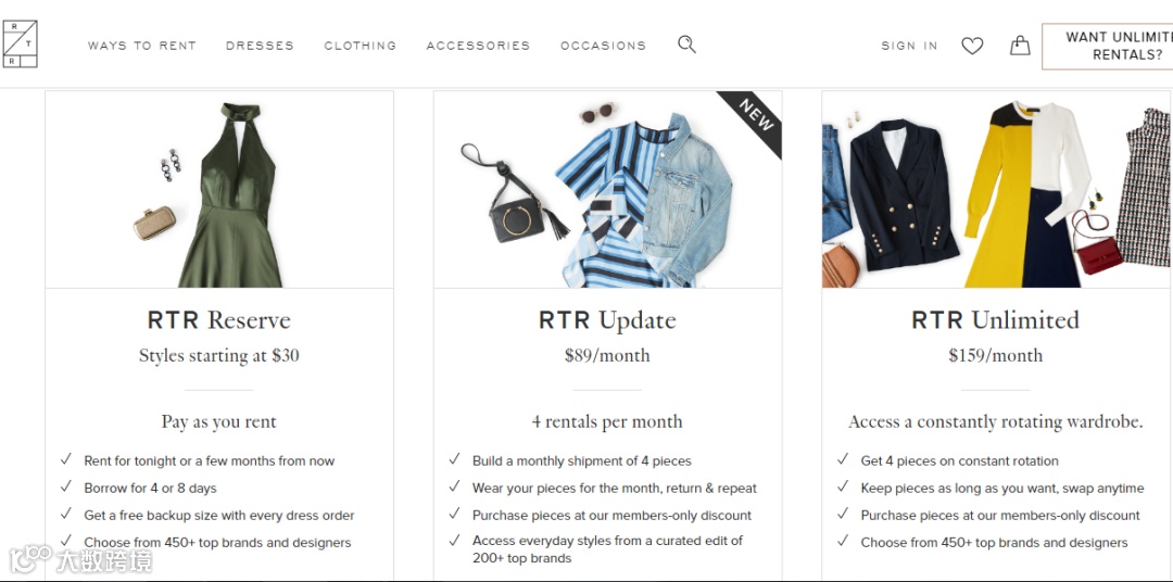 美国互联网时尚和奢侈品租赁平台鼻祖 Rent the Runway 向消费者出租她们日常“舍不得”购买的高价设计师或奢侈品牌服装、配饰,用于出席晚宴、婚礼等特殊场合的活动。而在2014年7月, Rent the Runway将线上租衣业务更进一步,推出每月99美元的包月租衣服务 Unlimited。