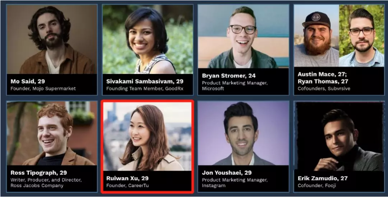 入选福布斯美国2020年度30岁以下精英榜对徐瑞琬而言,是给自己创建教育科技公司职图CareerTu最大的肯定。在美国亚马逊的事业上升期,徐瑞琬毅然放弃百万年薪和升职的大好机会,投身于互联网职场教育,只为了帮助企业培养更多的数字营销和数据人才,为即将毕业的大学生实现求职梦想。
