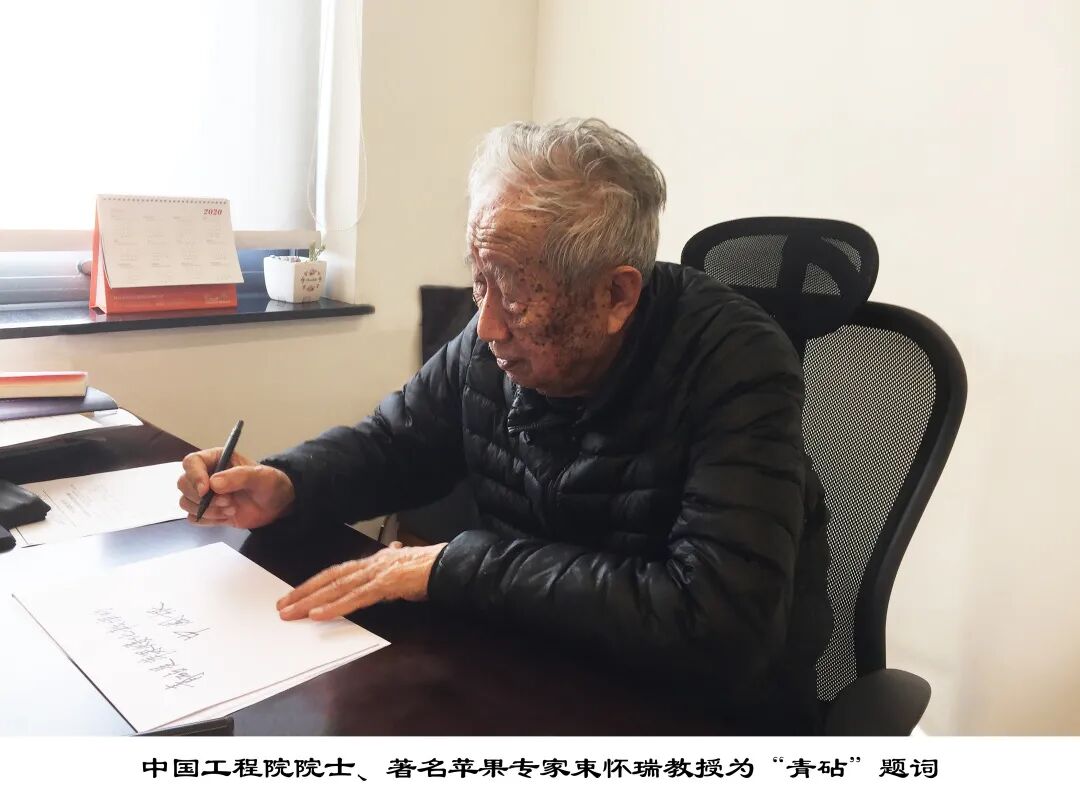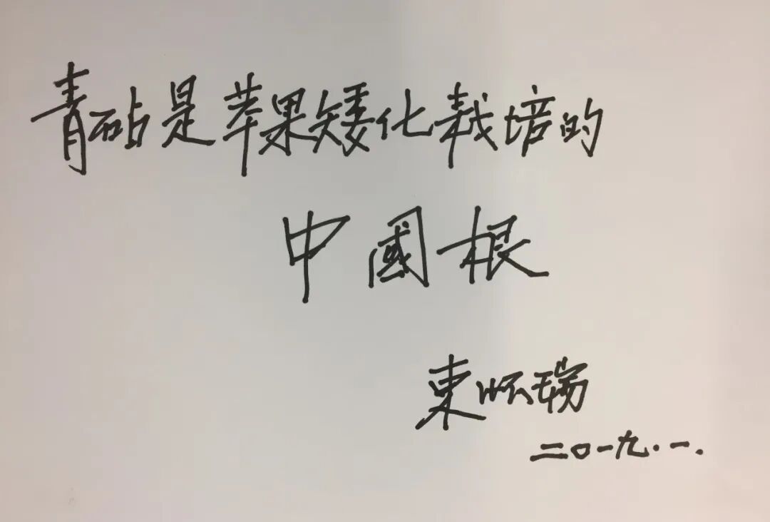 中国工程院院士、我国苹果产业泰斗级专家束怀瑞为其题词----“青砧是苹果矮化栽培的中国根”