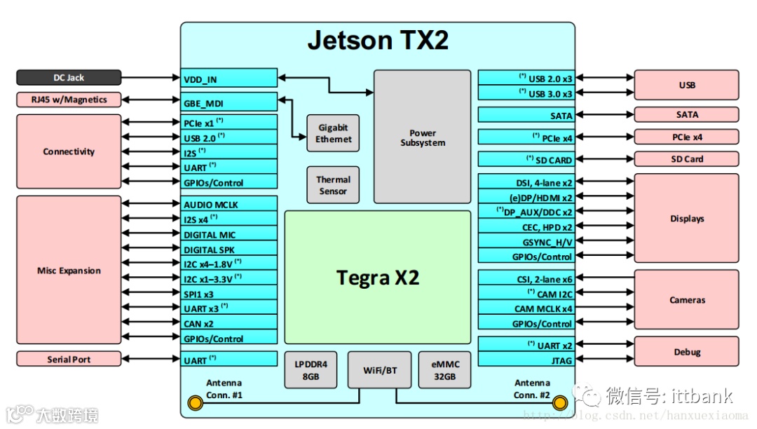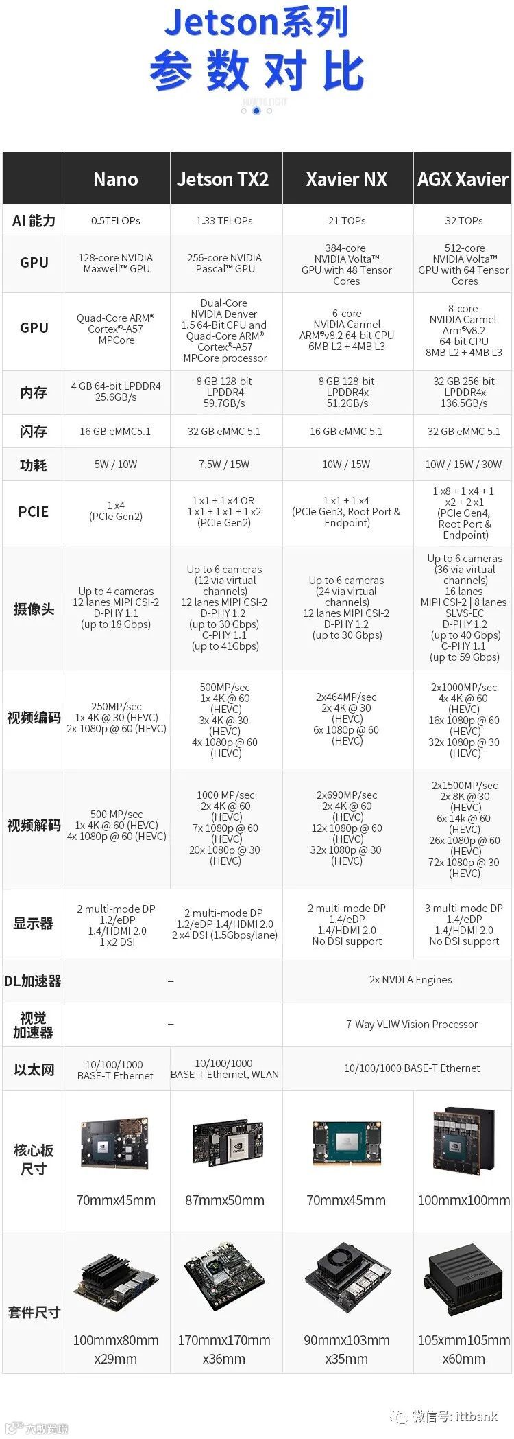 TX2的GPU和CPU都进行了升级,内存增加到了8GB、存储增加到了32GB,支持Wifi和蓝牙,编解码支持H.265,体型同样小巧。