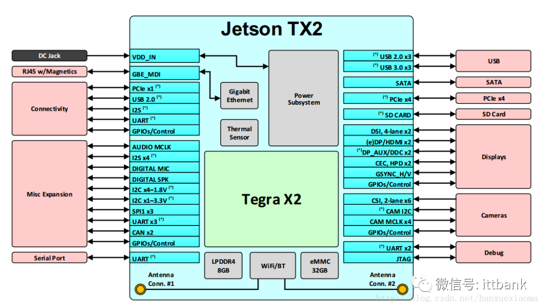 Jetson TX2还包括一个5MP摄像机在摄像机扩展头,和一个显示扩展头用于添加额外的显示面板。