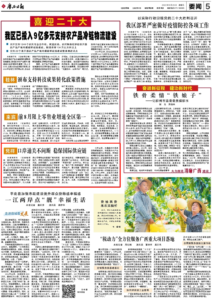 9月23日,《广西日报》要闻版刊登《凭祥:口岸通关不间断 稳保国际供应链》,报道近年来,为推动和保障中国—东盟国际供应链稳定和稳步前行,广西自由贸易试验区崇左片区利用中越“两国双园”合作平台,吸引企业“落户广西+转移越南”跨境布局生产,实现国内外产业链畅通衔接与正常运转,友谊关口岸成为近年来全国对越公路口岸中唯一不间断运行的口岸。