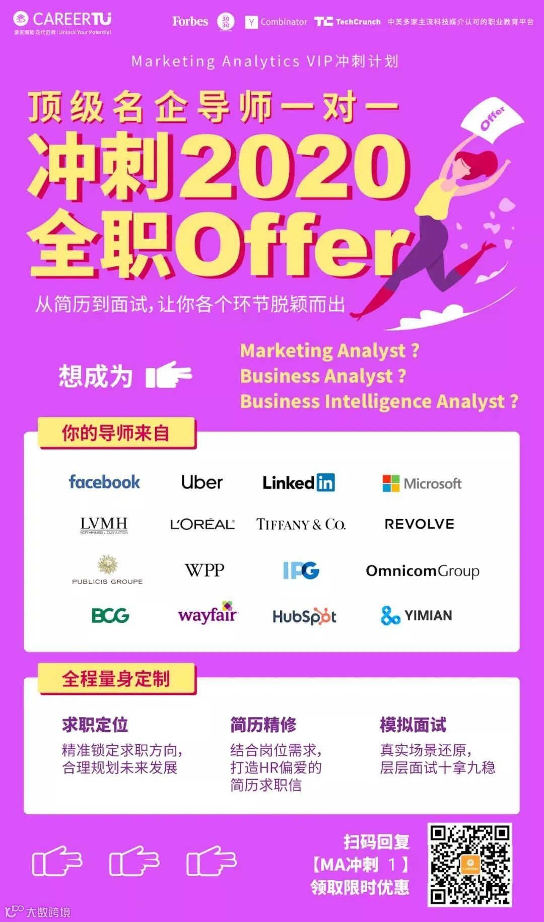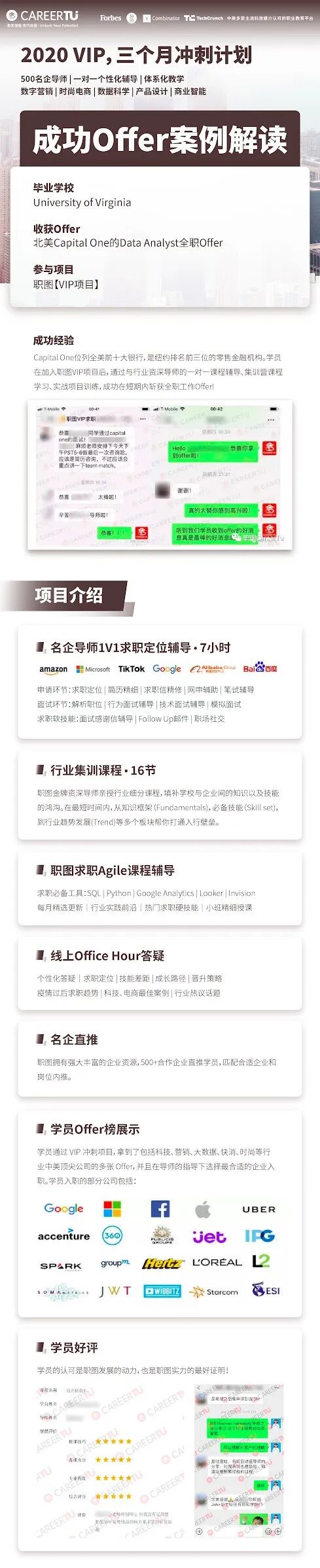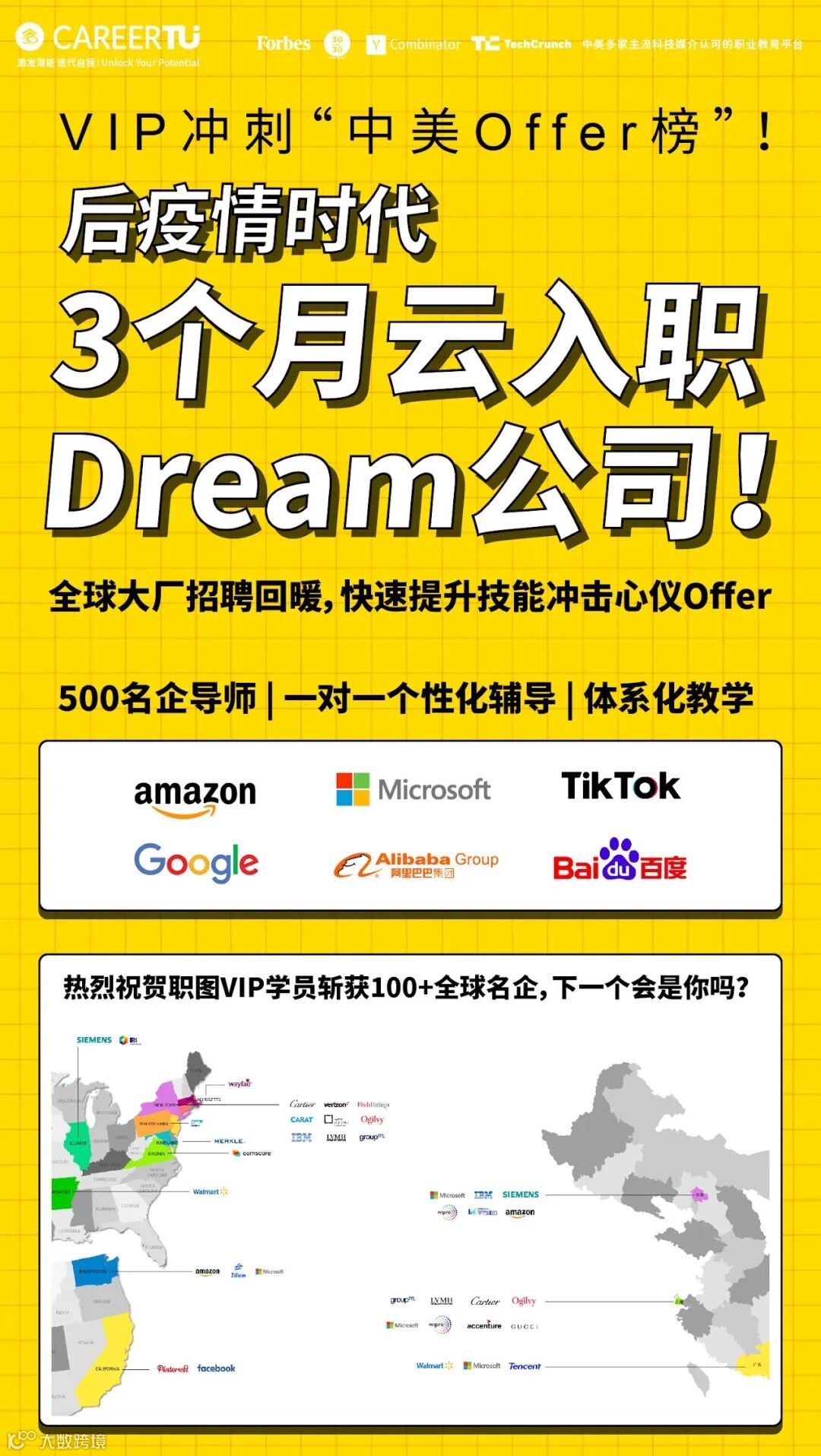 在过去的12个月,职图成功帮助同学们拿下了100+家公司的中美名企Offer,其中包括大量在疫情危机下成功云入职的案例。今夏全球招聘回暖,职图[金牌VIP冲刺课程]将在本月底全面来袭。三个月精心设计的课程助你在职场软、硬技能各方面快速提升,抓住这黄金3个月的时间,一举拿下心仪Offer。